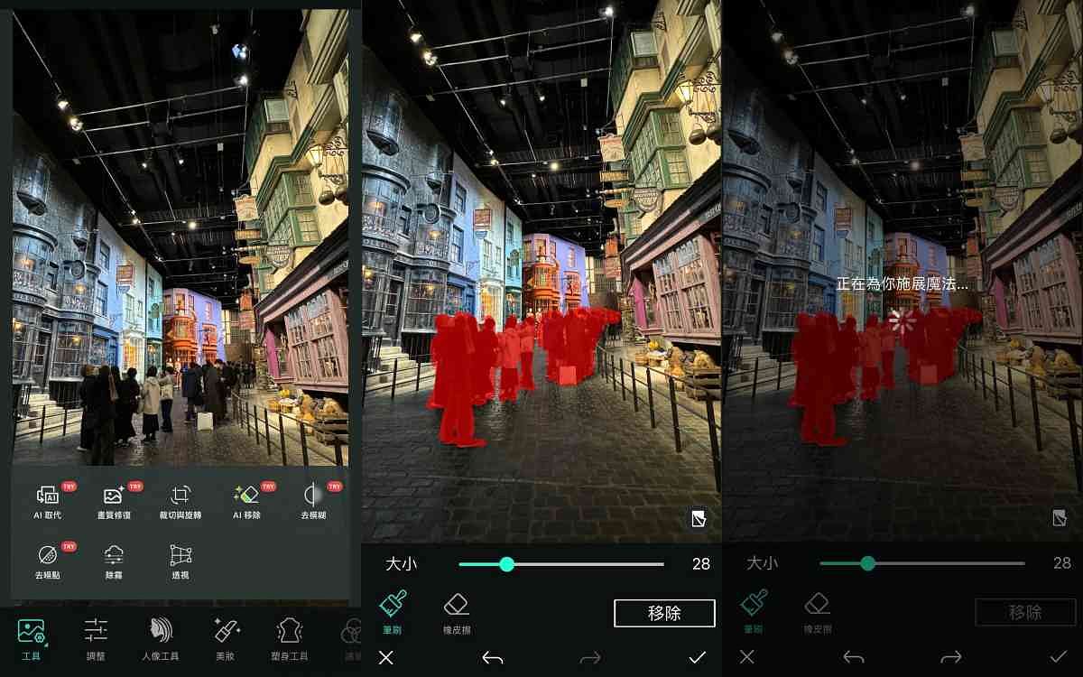 而這款照片後製修圖的APP「照片大師」是許多網友私推、強大好用的移除背景路人雜物的工具,只要選擇「AI移除」這功能並匯入想調整的照片後,就非常簡單明瞭好操作囉!可以隨意調整筆刷大小,也能用手指放大縮小照片以利於精準塗刷,也有橡皮擦可以修改塗刷區域,將要移除的地方都塗紅後按移除就完成囉!