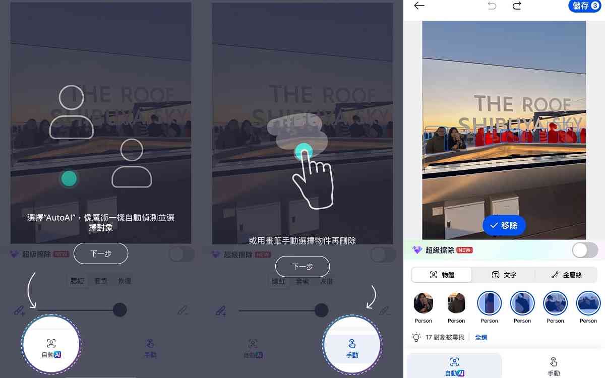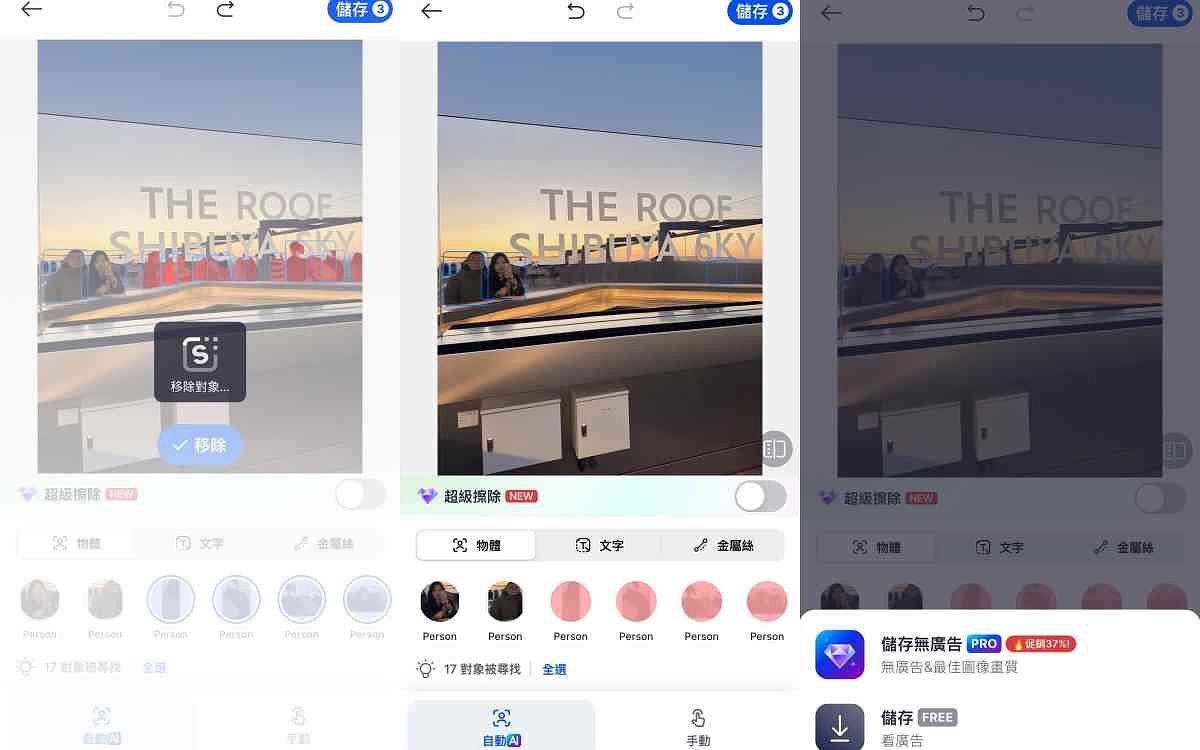 Snapedit雖然是付費APP(有前三天免費),但用過的人都大推!日常沒有大量需求的人,超推薦在出國玩時這種較容易有去除路人修圖需求的時候,將照片集中起來並利用免費試用期間將要修掉背景路人的照片都完成!只要打開APP點選「開始移除對象」挑選「欲修圖的照片」,再選擇下方「自動」APP就會自動偵測背景的路人及雜物等,並會顯示出偵測的結果,此時可以檢查有無遺漏的人及物,OK之後就點擊畫面中間「移除」就可以囉!一鍵去除惱人背景路人和雜物超方便,而且偵測十分完全,重點是也去除得很乾淨又自然,非常推薦大家下載~