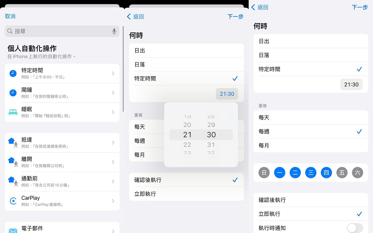 首先將iPhone手機內建的APP「捷徑」打開,在APP主畫面的下方功能欄選擇「自動化」,接著點選「新增自動化操作」,就會進到個人自動化操作的設定頁面,此時選擇「特定時間」來設定自己想要的時間、週期頻率,可以重複每天、每週或每月,而每週還能自己選擇哪些星期幾要設定、哪些不要,每月則可選擇每月固定的日期,十分方便又實用!