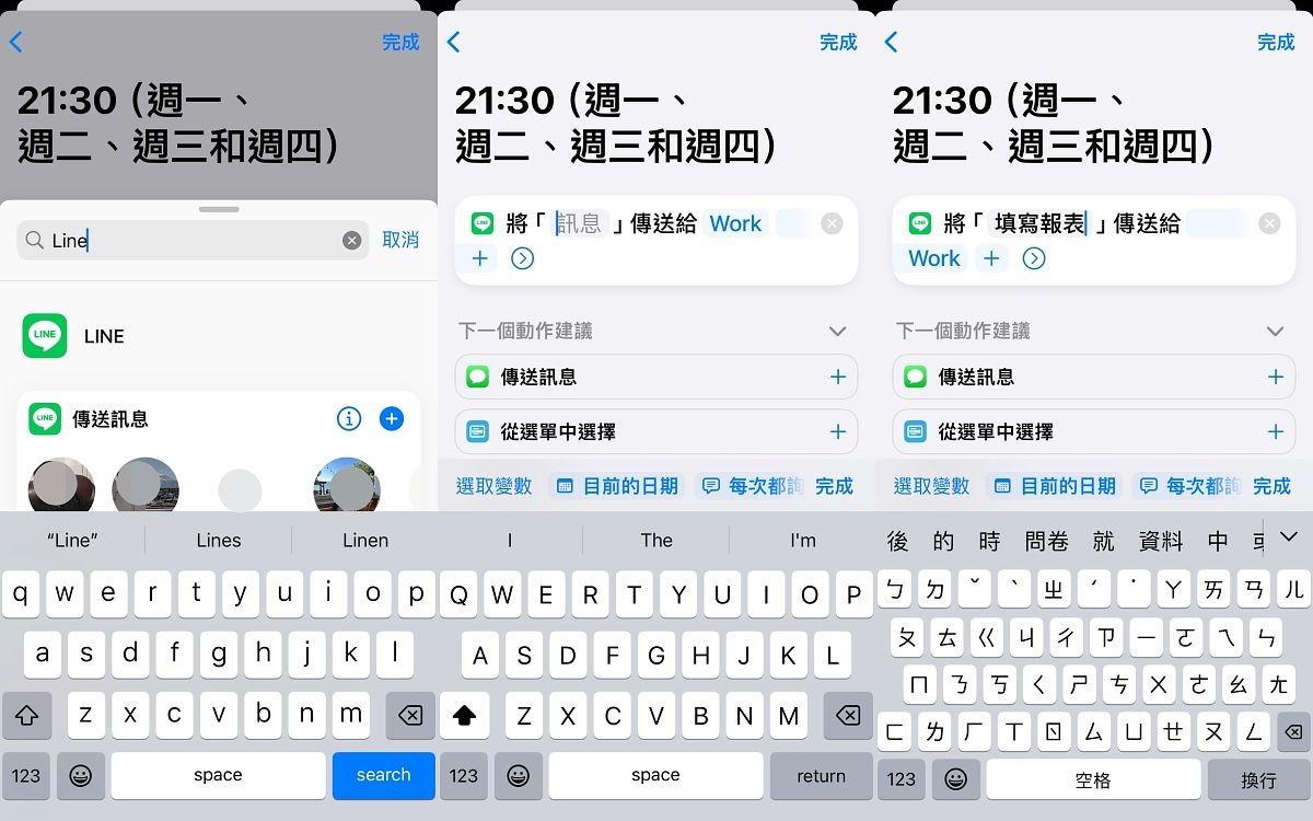 當時間與日期設定好後即可按「下一步」儲存自動化操作設定,接著在這個自動化操作設定中再以「新增空白的自動化操作」去開始使用,此時點擊「加入動作」可在「搜尋」處輸入LINE來設定「傳送訊息」的動作,挑選好聯絡人後能在「訊息」處輸入「想傳送的指定訊息內容」,按下完成後就OK囉!