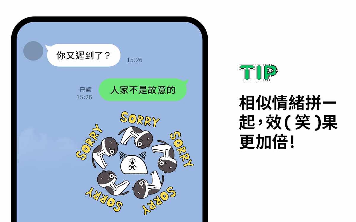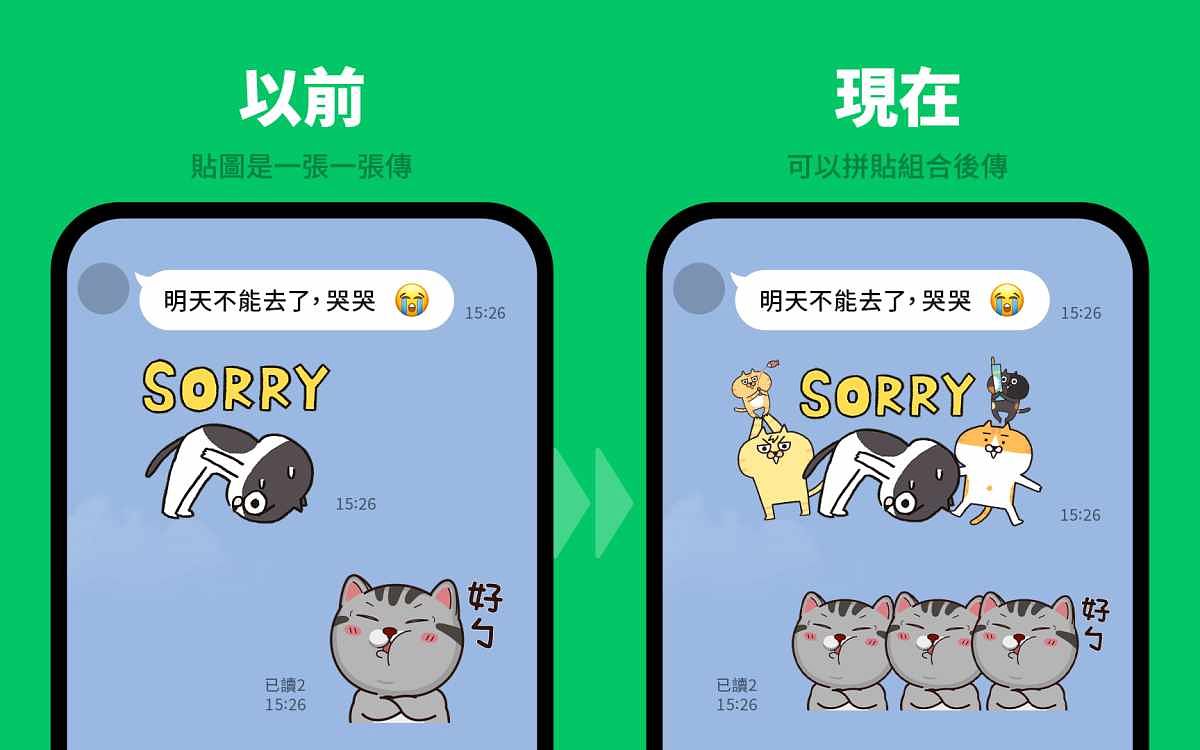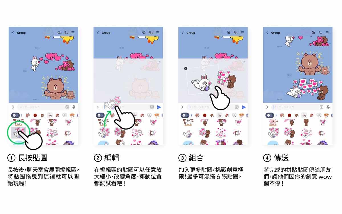 圖片來源:LINE 有別於過往一次只能傳送一張貼圖,全新組合技讓情感表達有新的方式!