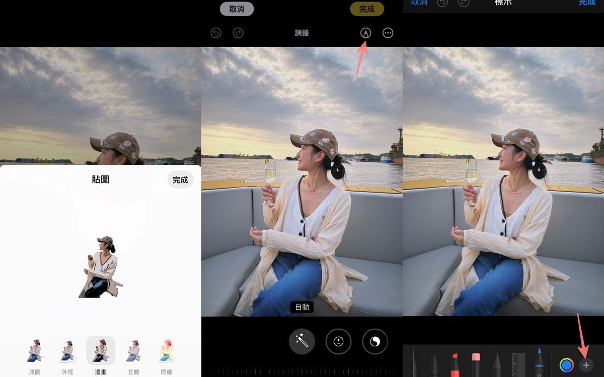 在效果當中選擇「漫畫」之後先按完成,退出。選擇編輯照片,點選右上的畫筆符號,接著按+。