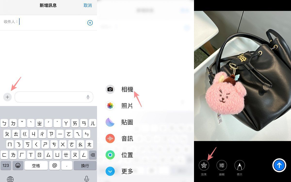 打開訊息後按+,打開相機功能後拍攝照片,接著點選效果。