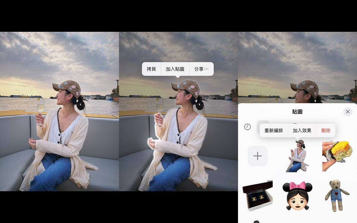 首先利用自蘋果更新至iOS17起推出的提取「原況貼圖」功能,先選取一張目標照片,長按主體加入貼圖,並且選擇加入效果。
