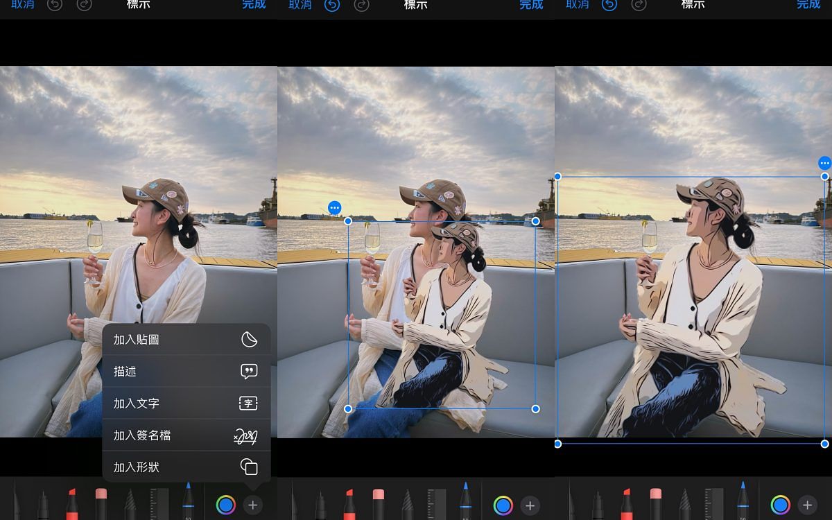 選擇加入貼圖,點選剛剛製作好的漫畫貼圖之後,調整大小後覆蓋在原始照片上,一張虛實合一的漫畫卡通風照片就完成了!