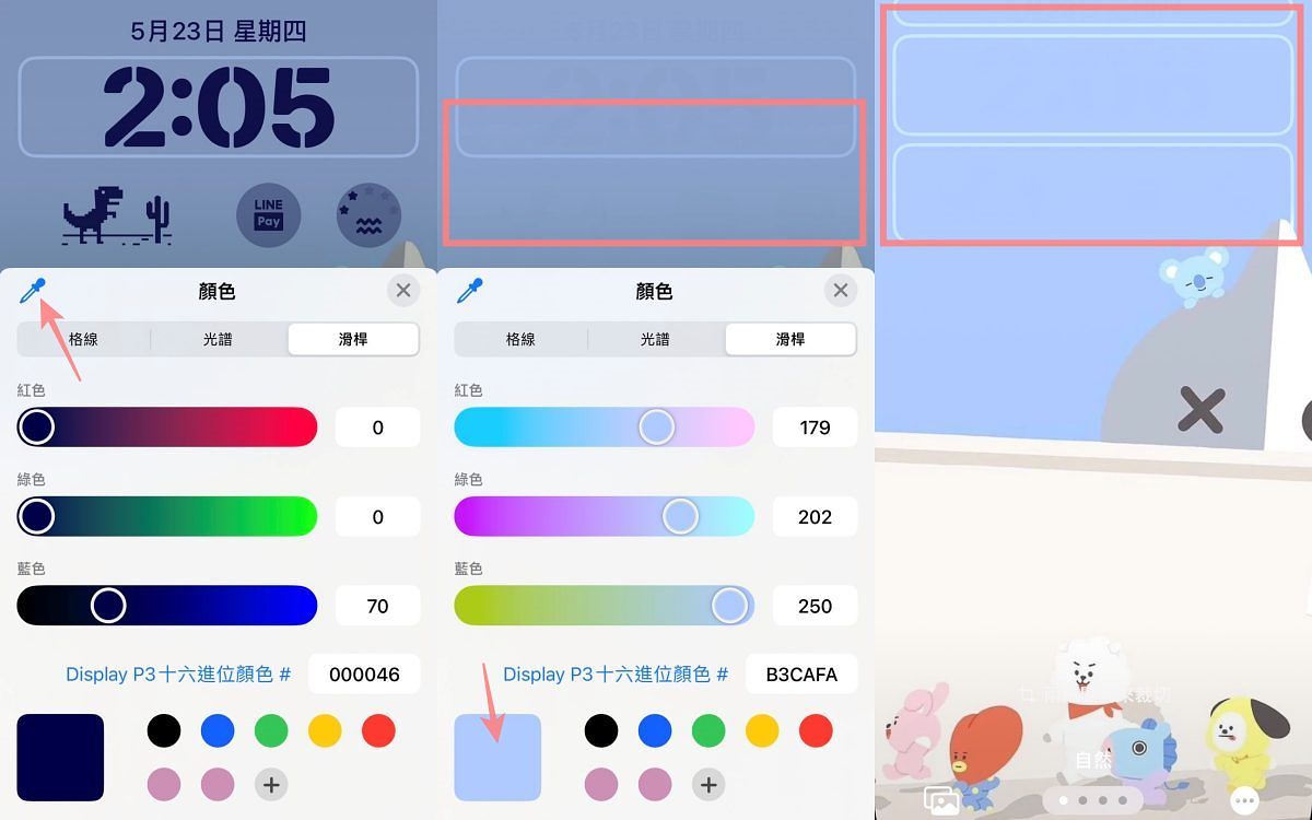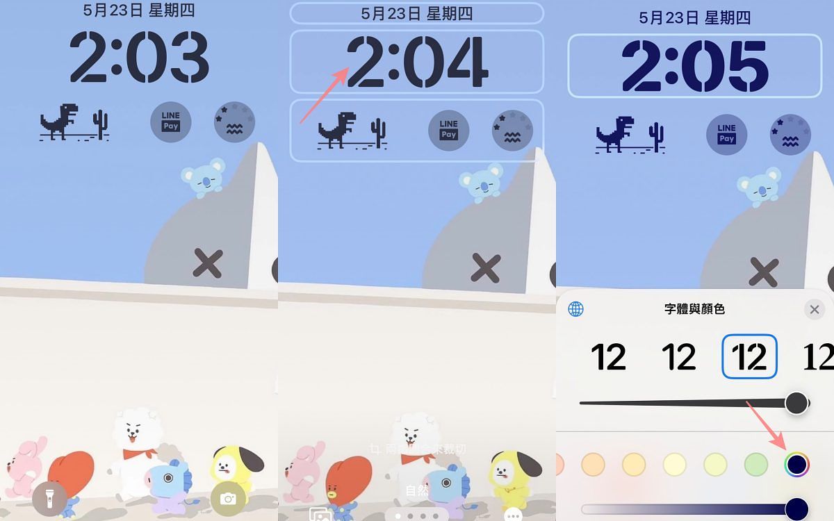 首先進入「鎖定畫面」 的設定,點擊「時間」更改字體與顏色。因為我們的目的是要將文字顏色隱形化,所以點選右下的色選框,來挑選符合背景色的文字顏色。