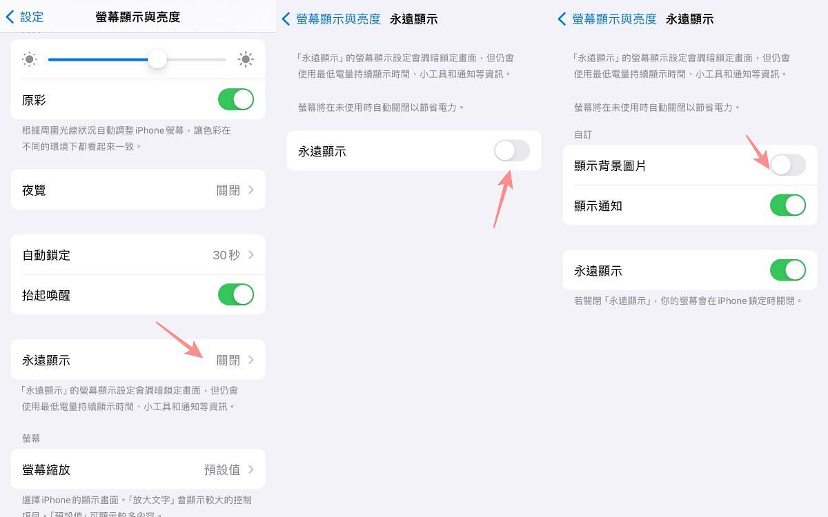 另外編輯要再做個小提醒~ 暗屏時的文字效果需要搭配iPhone 14 pro以上機型當中的「永遠顯示」 功能,記得把「永遠顯示」打開,然後將「顯示背景圖片」關起來,設定的呈現會更完美!