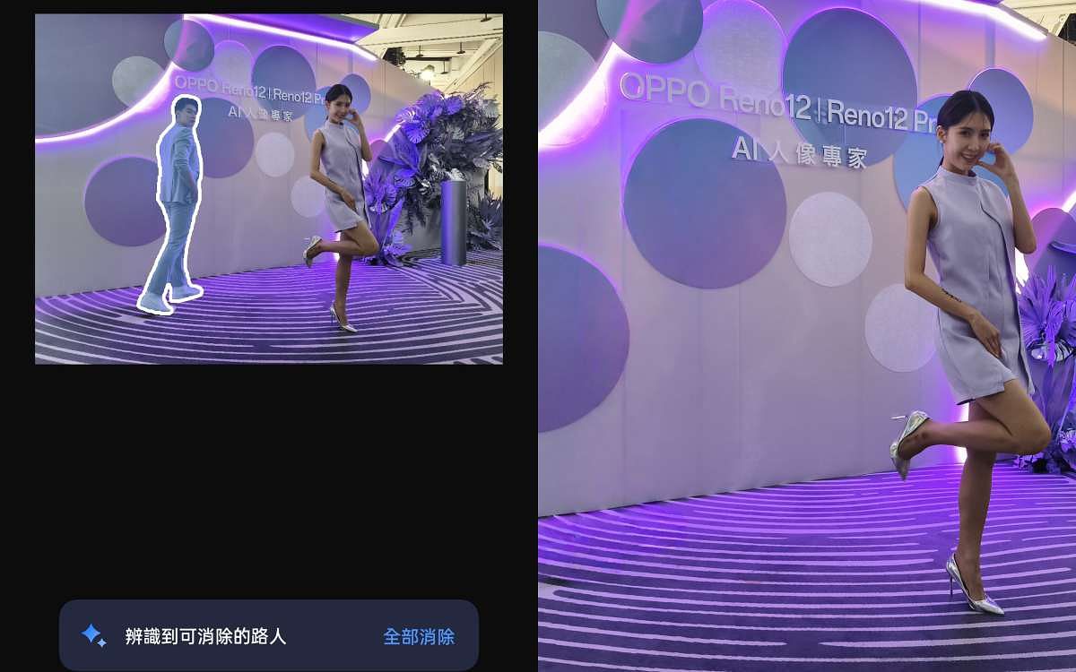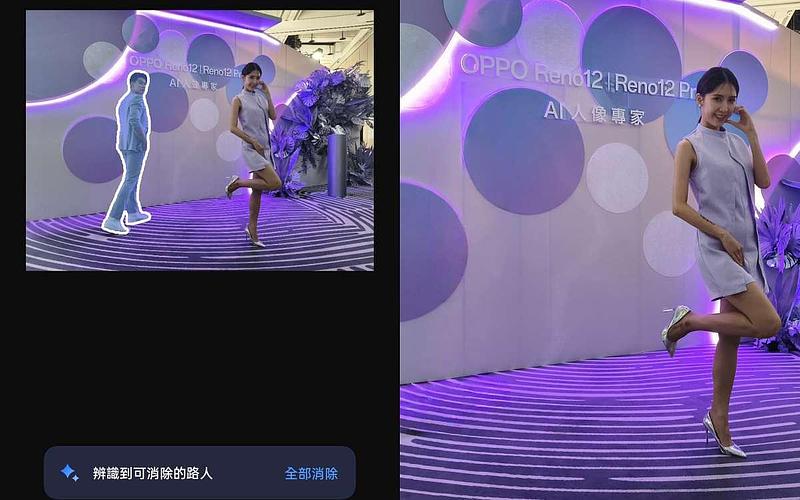 AI 橡皮擦2.0:從1.0版本的圖片圈選後智慧辨識和移除物件,2.0版本新增「一鍵路人消除」,只需點擊按鈕就能自動辨識、消除路人或物件等,同時精準生成填補畫面,創造完美構圖。