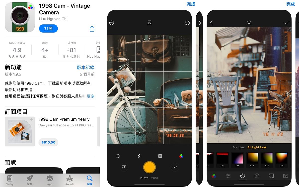 「1998 Cam」這款復古膠片相機拍照APP,模擬90年代最流行的復古相機,且是一個帶有日期戳的拍立得,能讓照片和影諞看起來具有模擬膠片的珍貴復古感。