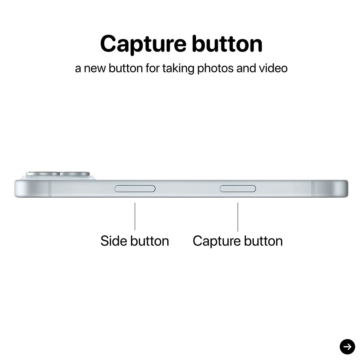 上回iPhone 15 PRO新增了「動作按鈕」,這次 iPhone 16 則是全系列都會配備「拍攝按鈕」,這個按鍵將會讓錄影更順手方便,橫向拍照時可以依據傳統相機的邏輯操作,使用上更加直覺。