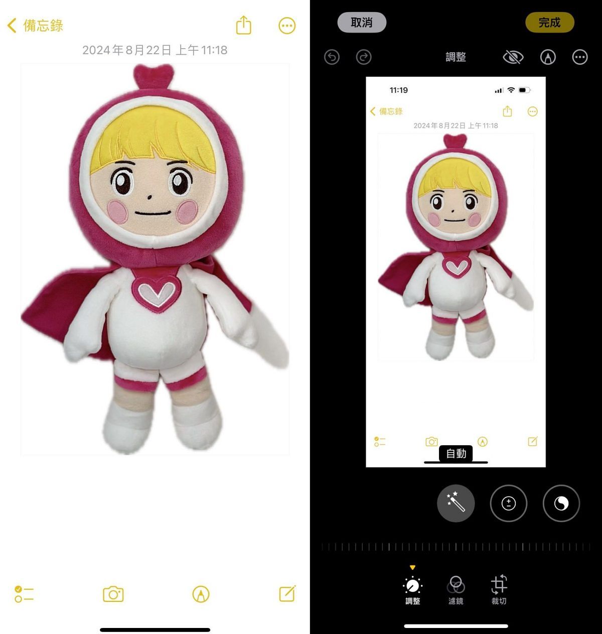3. 將圖像貼到「備忘錄」APP當中後,以螢幕快照截取備忘錄的照片,點按「編輯」和「裁切」。