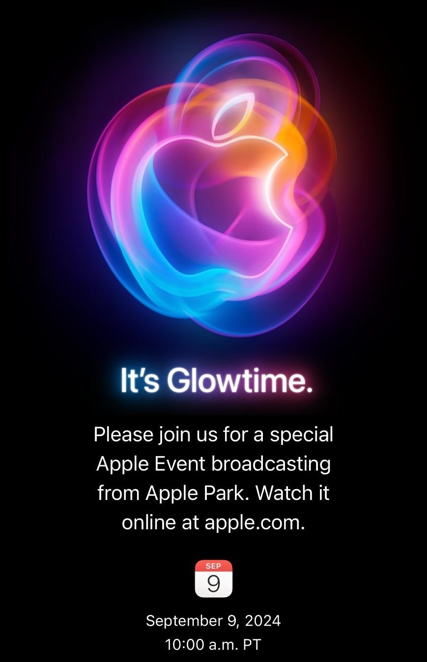 蘋果Apple於今天台灣凌晨時間正式發出秋季發表會活動邀函,這次的主題訂為「It’s Glowtime」,蘋果LOGO以絢爛七彩光環繞形成,讓人聯想到是全新siri設計,也呼應iPhone 16系列將要主推的AI (Apple Intelligence) 技術。