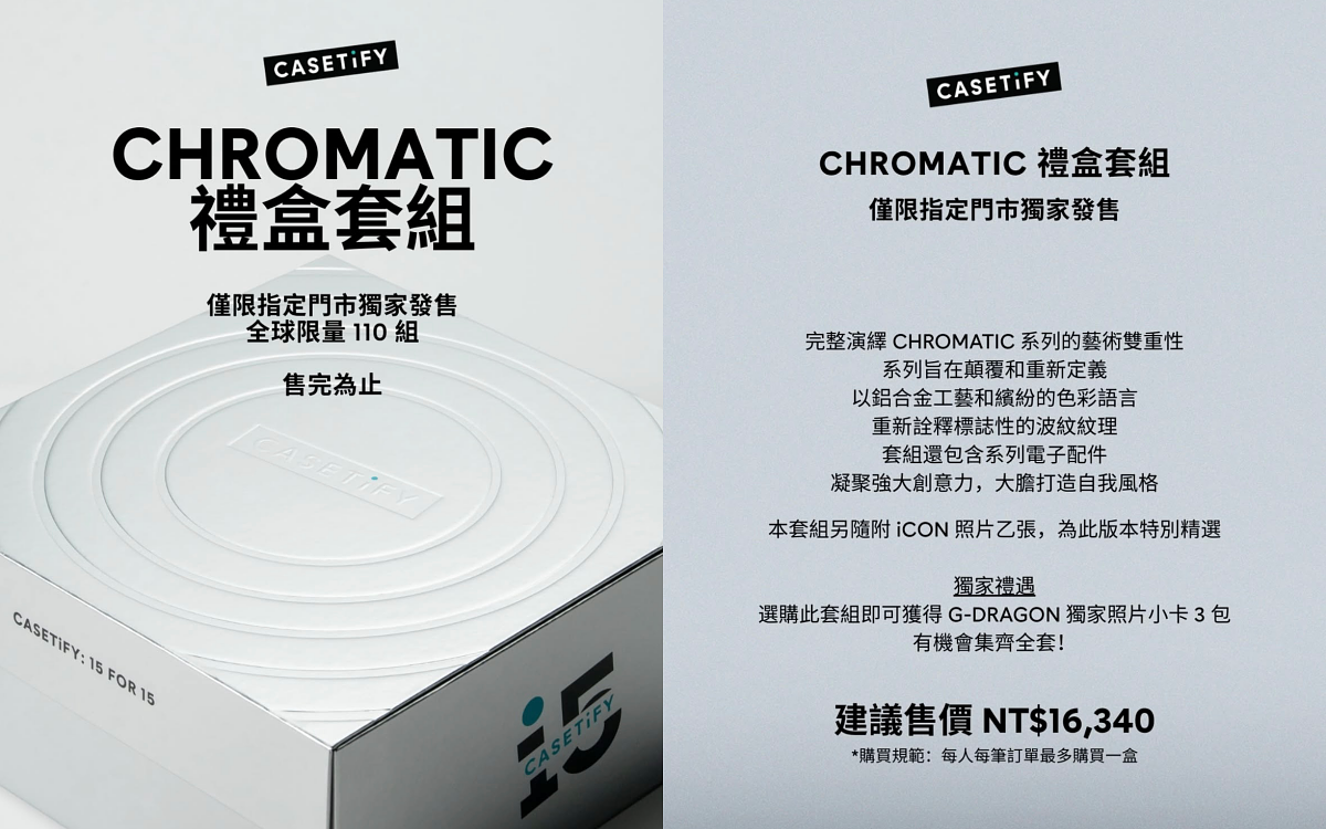 CHROMATIC: FORMS & HUES 系列從「形體之藝」展現的俐落金屬工藝,到「色彩之語」所激發的大膽視覺能量,每一款設計都是 G-DRAGON 的藝術感性與品牌美學的創意縮影。CASETiFY 將持續以前衛設計與創新科技為核心,推出兼具藝術與獨特風格的電子配件,陪伴用戶盡情展現自我。