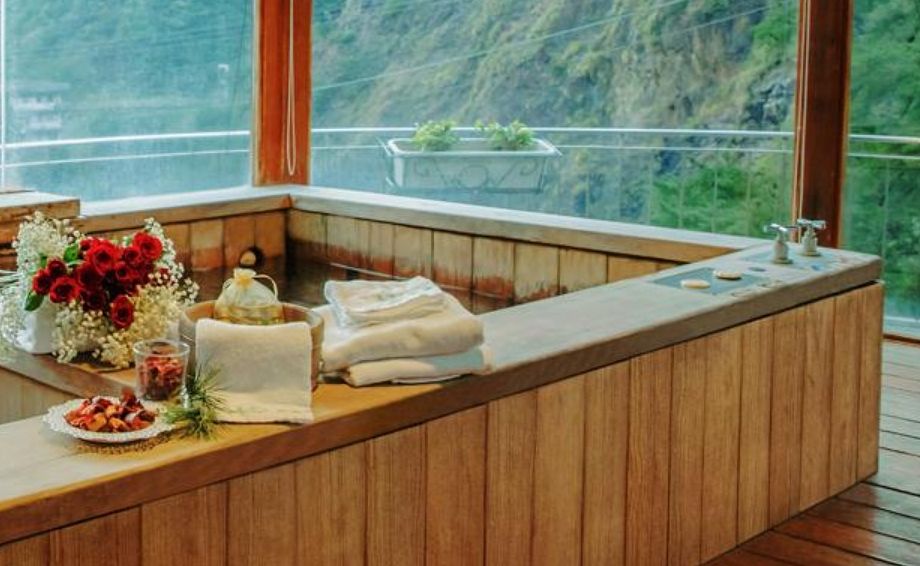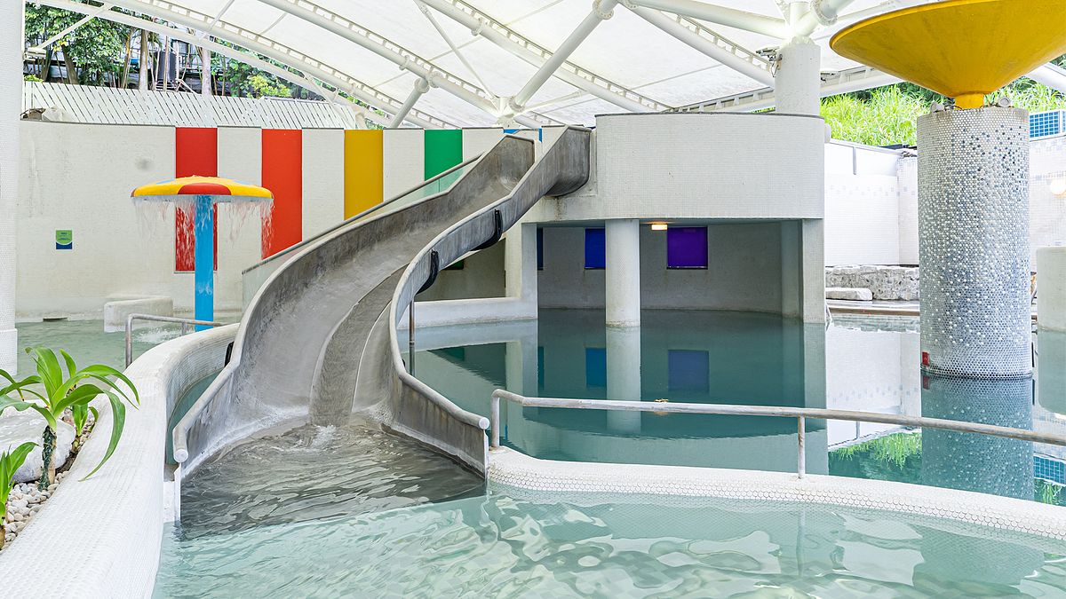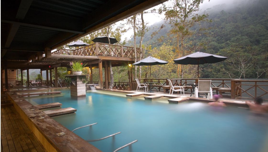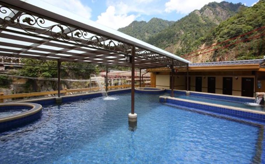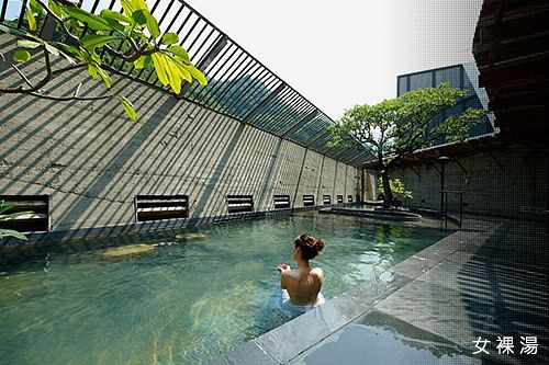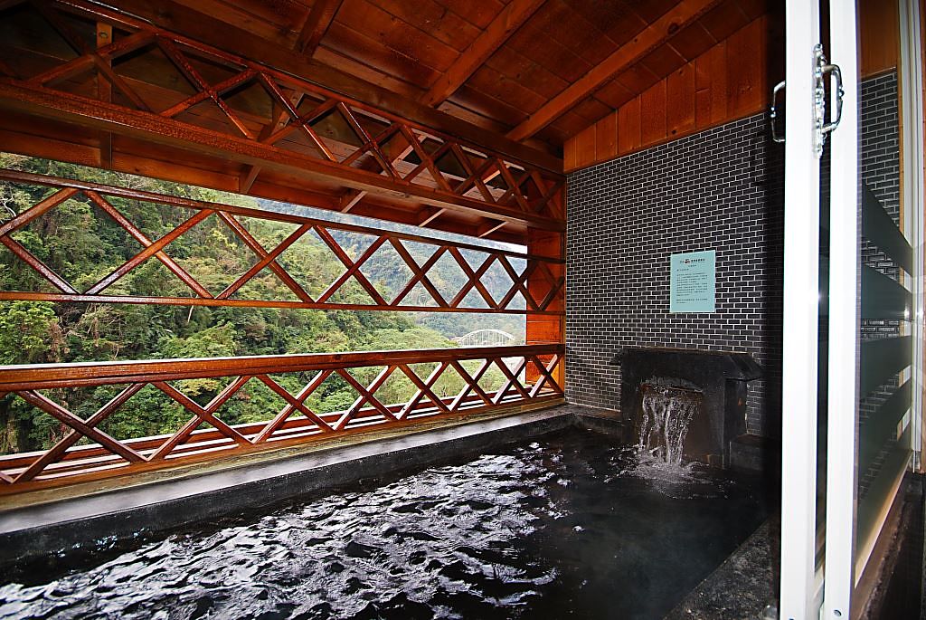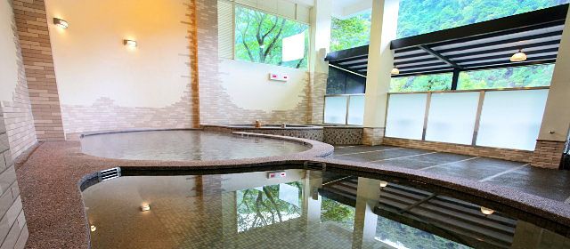 泉質為天然無色無味的碳酸氫鈉泉,半露天湯池上方採挑高通風設計,空間寬敞視野絕佳,泡湯同時可飽覽烏來美景。除了大眾湯池,也有房間與湯池採1:1比例設計的客房,想要邊賞景觀邊泡湯也沒有問題。