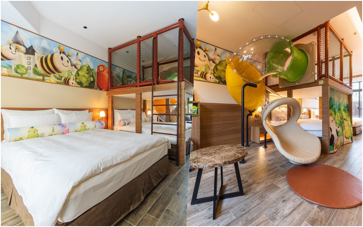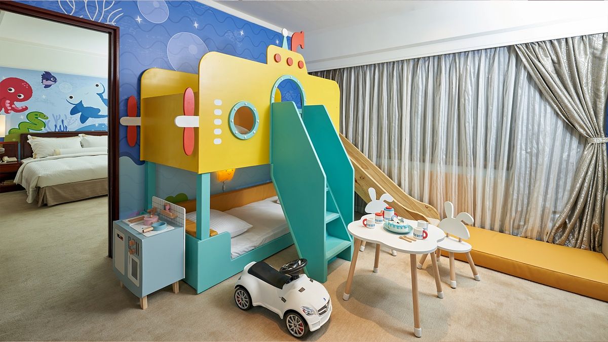 房內除了主題造型床外,還有兒童溜滑梯、小朋友專屬浴袍、清潔用品等備品。空間每一個位置都有安全保護措施,入住還致贈甜點主廚特製的專屬甜點能在房間內享用。