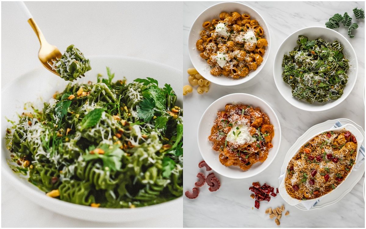 以菠菜及有機螺旋藻粉的翠綠麵條「開心果青醬蜂巢麵」,融合開心果、羅勒、蒜頭、起司濃郁飽滿香氣,吃起來層次感超豐富。