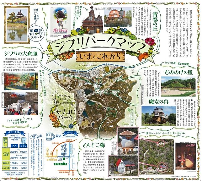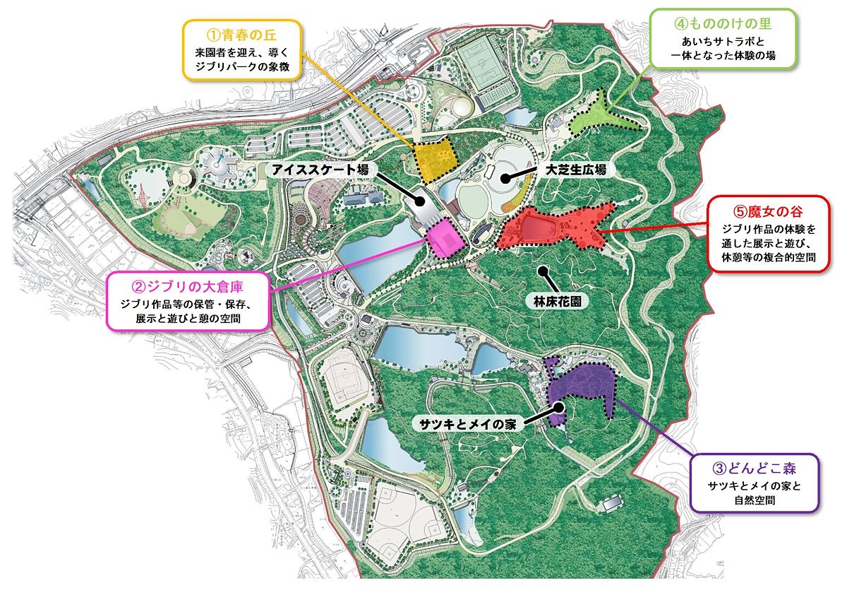吉卜力主題公園(ジブリパーク) 當中沒有大型的遊樂設施,遊客到此藉由步行於森林之間,感受風的吹拂,探索吉卜力森林裡的奧秘!2022年11月1日第一階段開放「吉卜力大倉庫(ジブリの大倉庫)」「青春之丘(青春の丘)」「DONDOKO之森(どんどこ森)」三個區域,預計於2023年秋天開放「怪物之里(もののけの里)」、「魔女之谷(魔女の谷)」兩個區域。