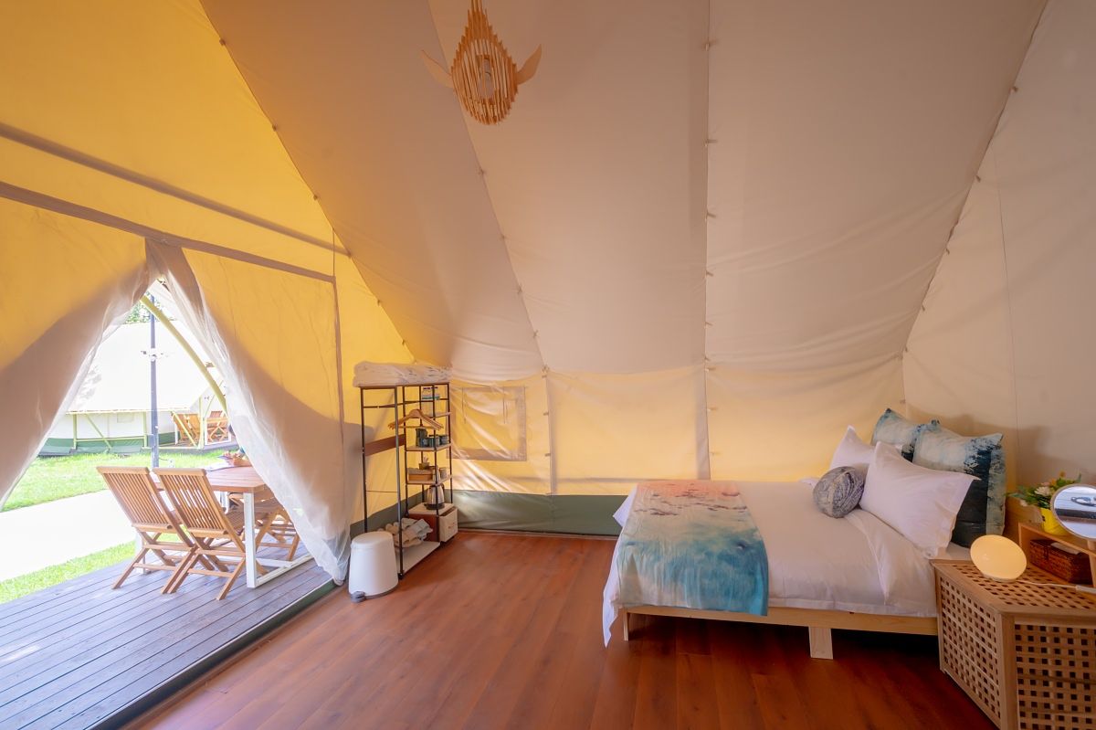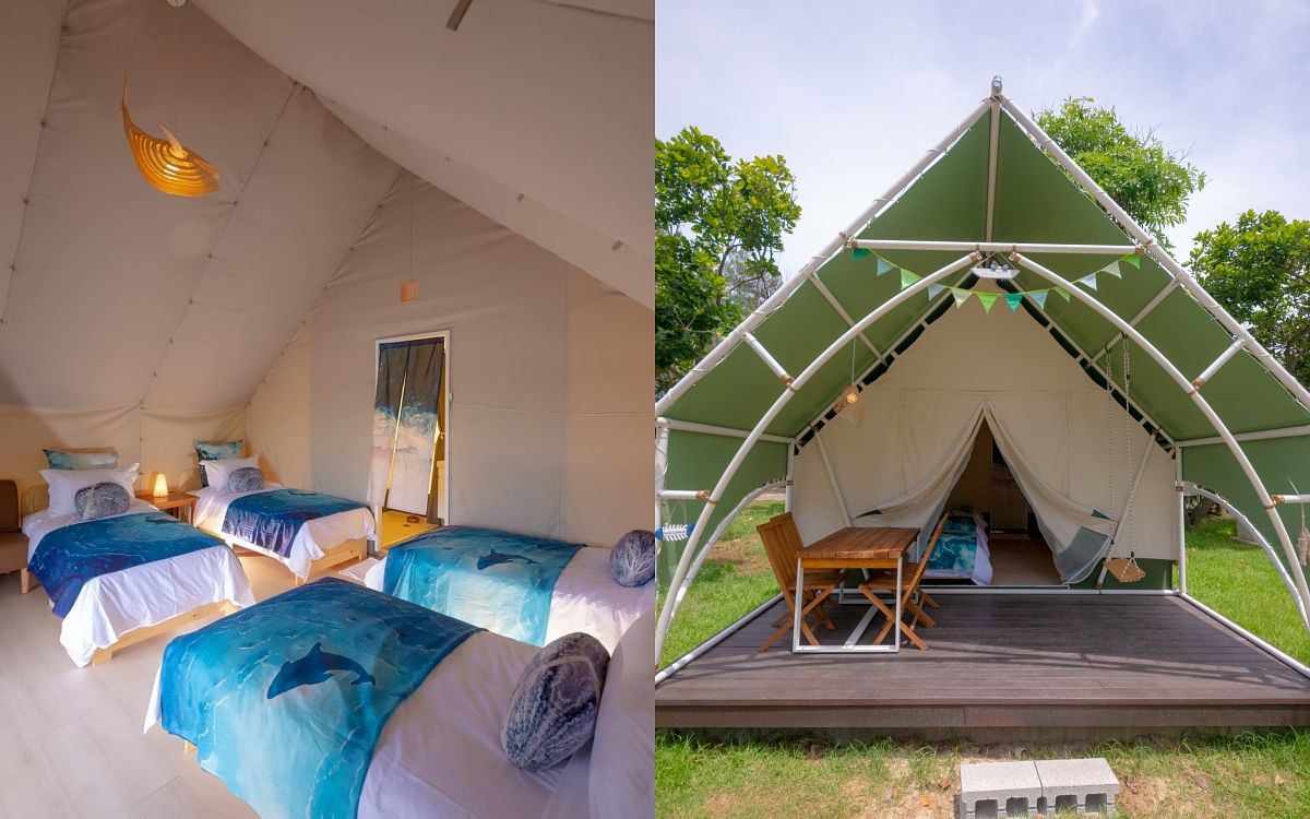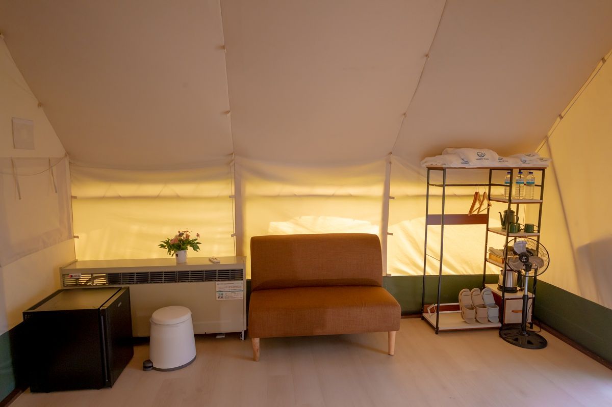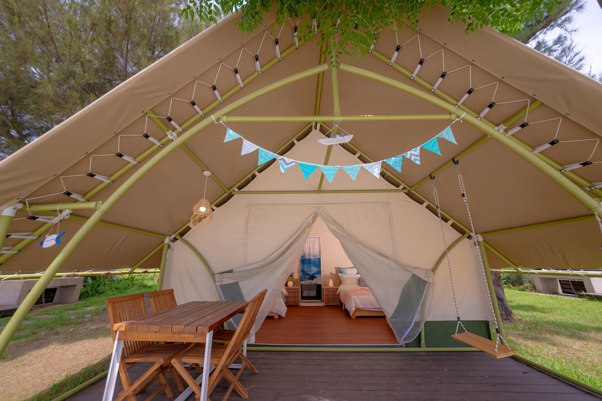 不會有強風吹襲的防風林內建置了32帳豪華露營帳篷,分別設有「二人、三人、四人」床型,精選國外進口頂級帳篷帆布,量身縫製防火、降噪、抗紫外線的帳篷,寬敞舒適。備有沙發、電風扇、冷氣機、精緻床墊、寢具與獨立衛浴等高級設備,每房皆備有熱水壺及茶包咖啡,可在專屬的戶外座位區享用。