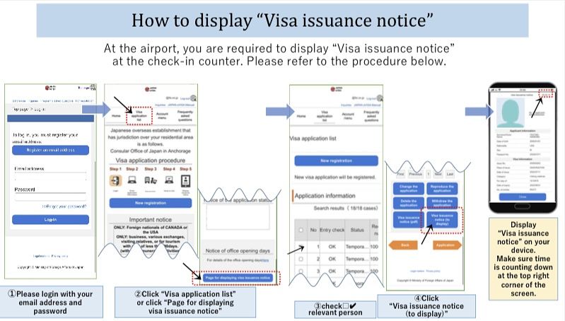 在日本機場時,必須在入境機場時登入行動裝置,並且於線上出示「visa issuance notice」,請注意電子簽證不得以PDF檔、螢幕擷取畫面或其它任何方式出示。
