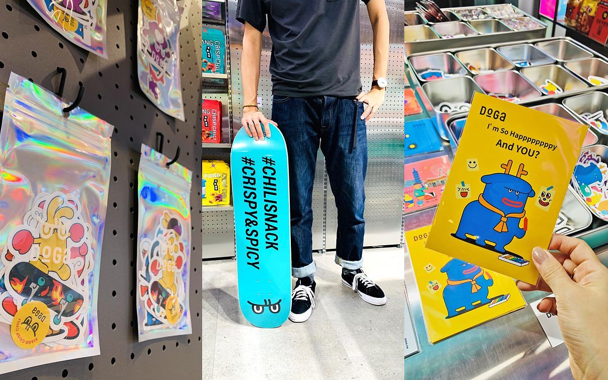 而 DoGa 這一次改頭換面,不只提供各種令人難以自拔的零嘴,也以 DoGa 2.0 的全新家族成員作為靈感,打造了一系列延伸的紀念商品,像是能夠重複利用紙袋、炫彩提袋作為周邊,還有包括 T-Shirt、紙膠帶、貼紙、明信片組等日常物品,最特別的是設計滑板,以 A、B 兩種款式,象徵年輕世代的火辣無懼,突破一般食品行業的想像範疇,賦予 DoGa 全新能量。