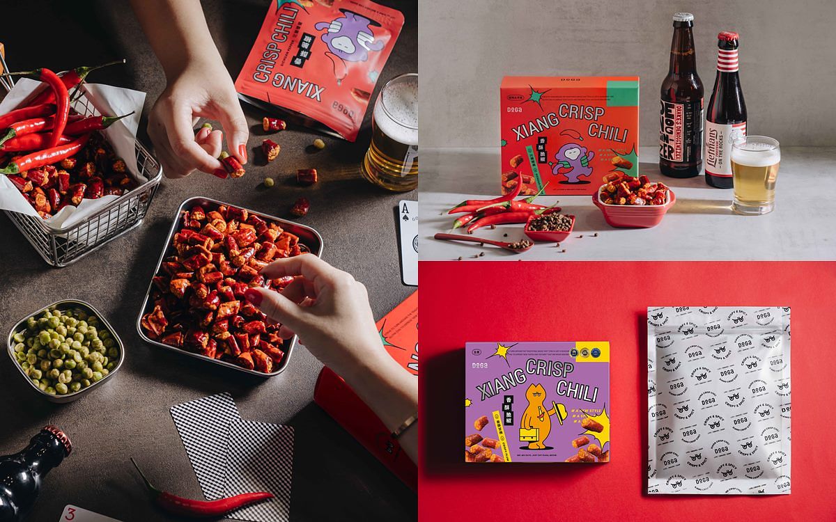 為 18 歲品牌賦予新生,DoGa 攜手良艮創意 Mounts Studio 團隊打造 Logo 與全新視覺。Logo 簡潔化並賦予現代感,而原有由一群動物構成的大家族視覺以 2.0 方式改造,第一代的紅眼辣椒雙手兔變身成熱心勇敢的拳擊 DoGa 兔,佇立在銷售冠軍第一名的墨西哥椒封面上,其他款香酥脆椒的全新盒裝上,也各有著令人眼睛一亮的卡通角色,以有趣而不過度童趣,活潑但不低齡化的美感方向打造,每一個成員都有著自己獨特的外表與個性,完美呼應著DoGa 香酥脆椒的琳瑯滿目與其各有迷人之處的涮嘴風味。