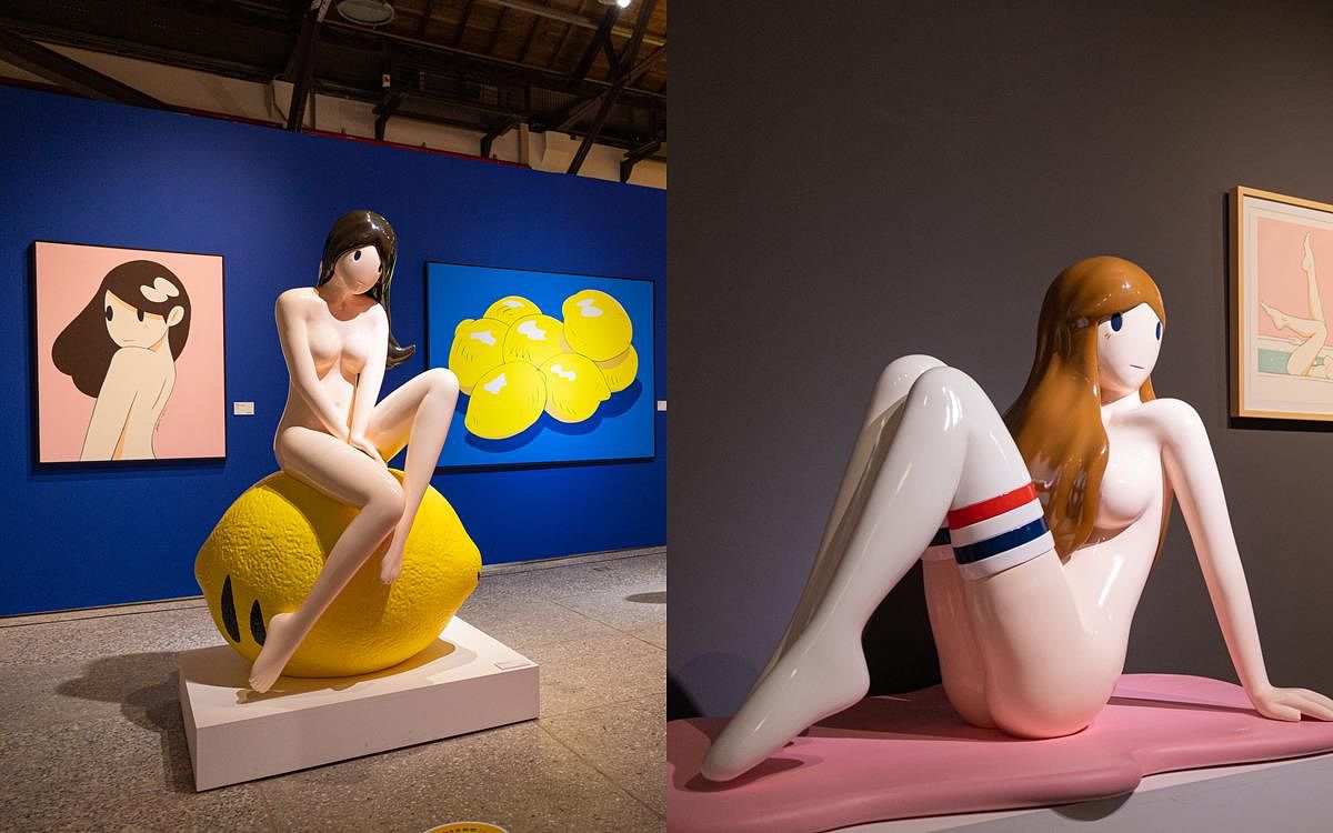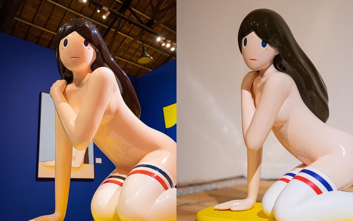 右圖:天野タケル首次台北大型個展「穿襪子的維納斯」巨型雕塑。(APOL Gallery提供)