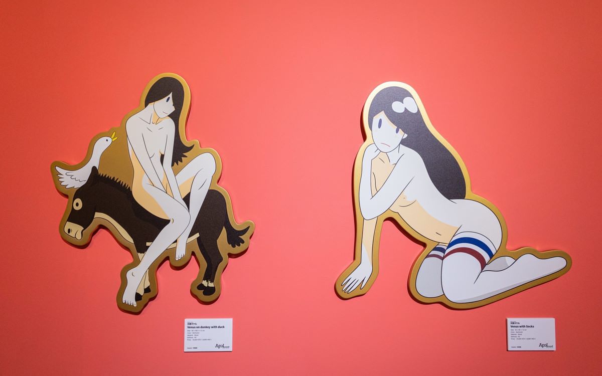 由東京當代藝術家天野タケル親手打造的 VENUS 女神角色,以討喜的五官與外型、精緻的身形以及舒服的配色運用而令人著迷。展覽周邊部分除了精美雕塑藏品,還有精緻的「驢背上的維納斯與鴨子」與「穿襪子的維納斯」等兩幅木版畫作品。不僅透過藝術家的筆觸勾勒出女人可以性感也可以美麗且兼具善良與叛逆特質等多元面向,也透過動物與穿襪子等熟悉的動物與物件,讓欣賞藝術品的同時,彷彿也讓人們增添更多想像空間,近一步拉近與「女神」之間的距離。