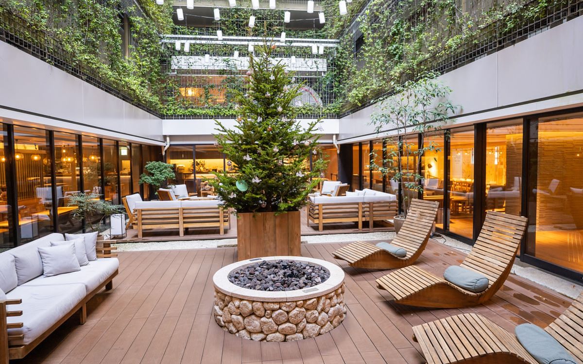 「GOOD NATURE HOTEL KYOTO」中庭的休憩區域,彷如城市中的一片綠洲。「京阪控股株式會社」提供
