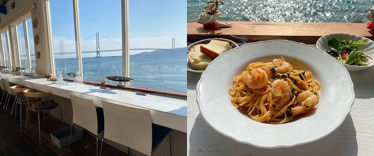 來到垂水舞子一帶,不妨找一處咖啡廳欣賞海岸風光,一邊享用美食, 度過悠閒午後。遠眺明石海峽大橋的「fiesta」是很熱門的海景餐廳,以供應義式料理為主,義大利麵、甜點、披薩都是受歡迎的菜色,面向明石海峽大橋的海景座位即使平日也座無虛席,建議到訪之前先預約。