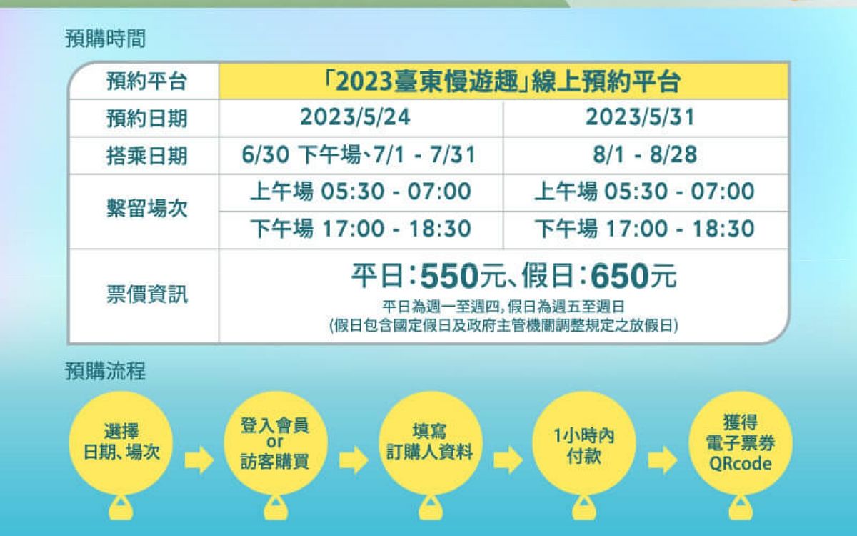 「熱氣球繫留體驗」於6月30日起至8月28日止,每日規劃05:30-07:00上午場與17:00-18:30下午場兩個場次(6月30日配合萬球齊飛活動,僅提供下午場次),每場線上購票開放80位名額,並以搭乘月份分為兩階段進行預約。第一階段於5月24日中午12點開放預約6、7月場次,第二階段則於5月31日中午12點開放預約8月場次,總計119場,共9,520位名額,每張體驗票為單人單場使用,每筆訂單最多限購2張。票價部分,平日票(週一至週四)每張550元,假日票(週五至週日以及國定假日)每張為650元。