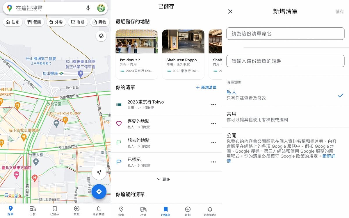 出國旅遊最費工夫的絕對是行程規劃,不僅要適當安排景點位置、距離與時間,還要規劃方便的路線,推薦大家可以在Google map中新增清單,可依照地區、天數或地點等各式類別去建立,將找到的景點、餐廳或店家等直接儲存到該清單中,不用額外彙整龐大的資訊,輕鬆打開地圖就能知道各地點的位置及豐富資訊,更方便就近安排行程規劃,且清單也能夠直接分享給旅伴喔!