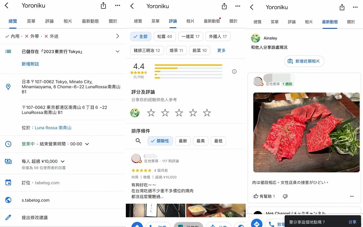 基本上出國時只要有Google map就沒問題!除了儲存想去的地點之外,地圖上還可以輕鬆查看地點的資訊,包含地址、營業時間、訂位方式、網友評論等,相信大家對於這些功能都非常瞭若指掌,在外旅遊時務必要善用這個功能來確保景點或店家是否休息或需提前訂位或買票,另外還有一個最新動態功能可以看到關於地點最新的消息,也超級實用的呢!