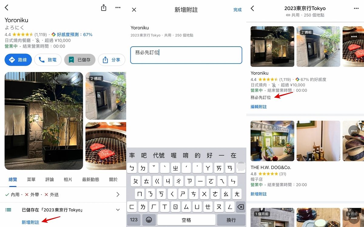 對於規畫行程的人來說,單單只有儲存的功能絕對不夠,其實Google map上每個地點除了查看資訊,還能自己手動新增附註,不用將每個地點的其他資訊額外做彙整,可直接在地點下方備註有關資訊,如必點人氣餐點、景點打卡技巧、特殊需求等,當再度查詢時就會直接看到提醒自己囉~