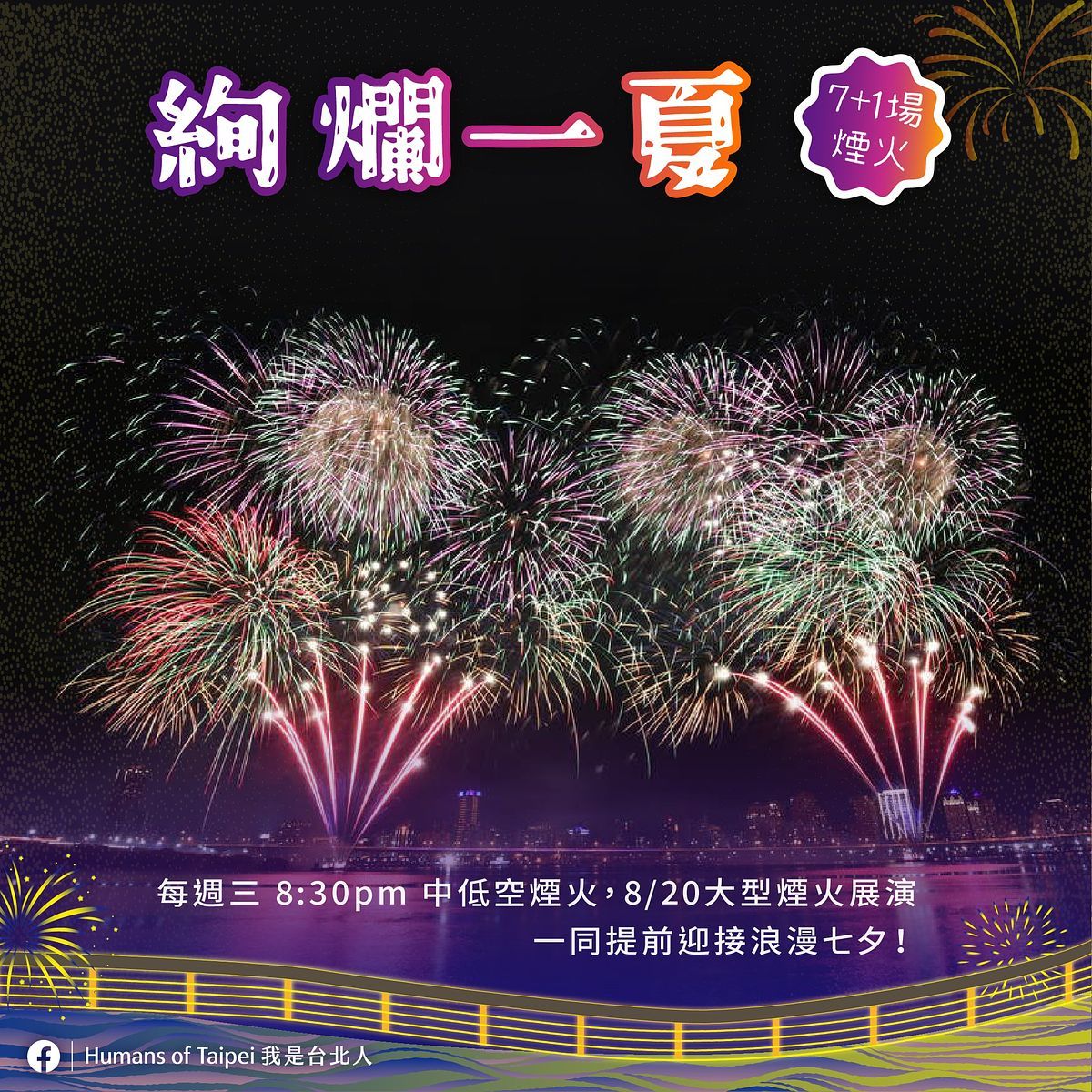 今年的大稻埕煙火不同以往,將自7月1日起連續施放8場煙火,日期分別是:7/5、7/12、7/19、7/26、8/2、8/9、8/16、以及8/20,每週三晚間8:30施放3分鐘中低空煙火,而在8/20這天將會是最盛大的一場煙火秀,以大型煙火展演與大家一同迎接浪漫七夕。