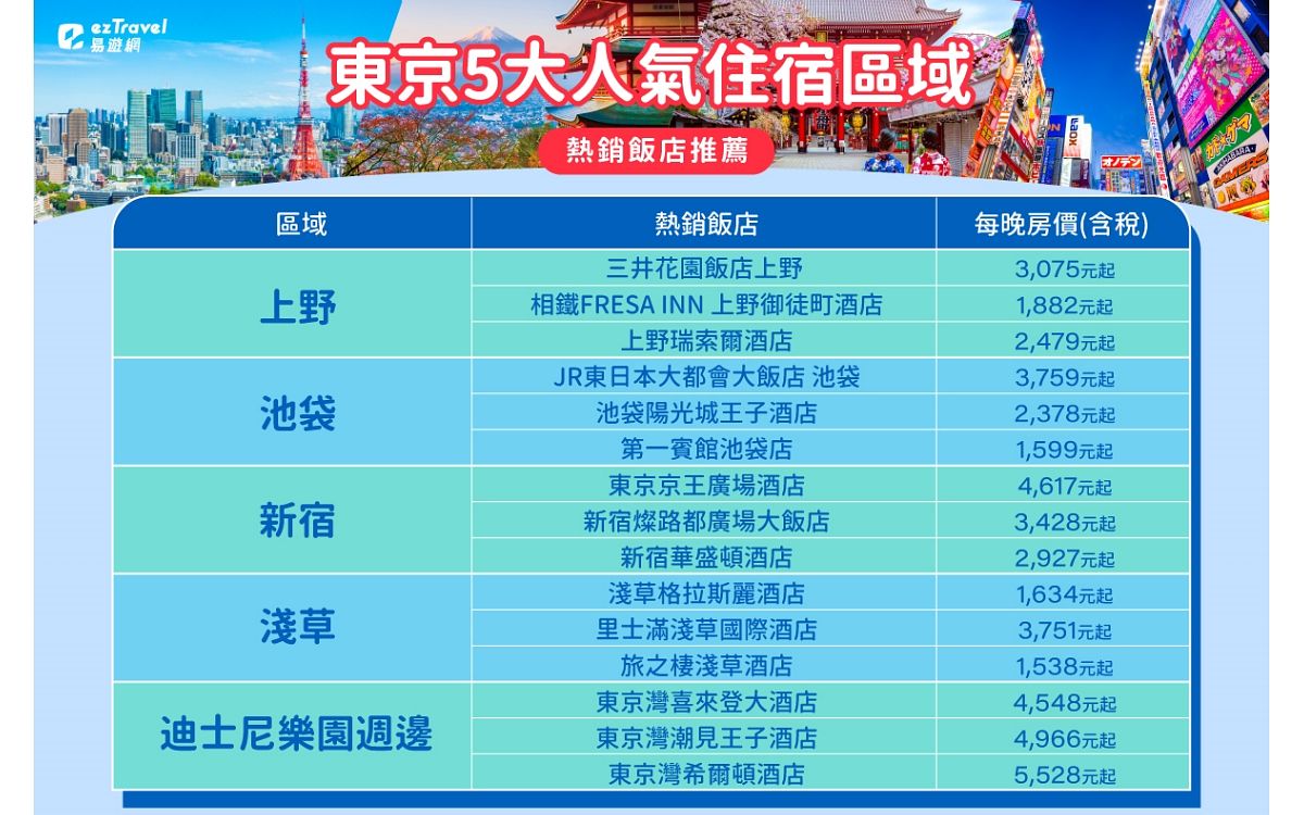 疫後出國最顯著的旅遊消費變化,就是旅遊天數有拉長的現象,以國人最愛的旅遊地日本來看,根據易遊網日本訂房的銷售數據顯示,今年上半年銷售間夜數已較2019年成長3倍,其中東京訂房的佔比更高達4成以上。進一步分析今年上半年東京訂房銷售統計,最熱門的5大住宿預訂區域分別為上野、池袋、新宿、淺草和迪士尼樂園週邊,以下整理各區住宿優點與熱銷飯店推薦給大家參考。