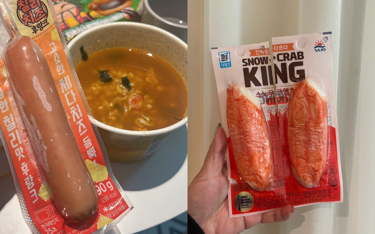 喜歡吃熱狗、蟹肉棒的話,韓國各家便利商店也有眾多選擇,有單純的熱狗、起士口味、辣味等等各種選項,蟹肉棒也有這種巨大版,也可以直接開袋吃~出國旅遊必不可少的泡麵加上這兩項,是在太幸福了!