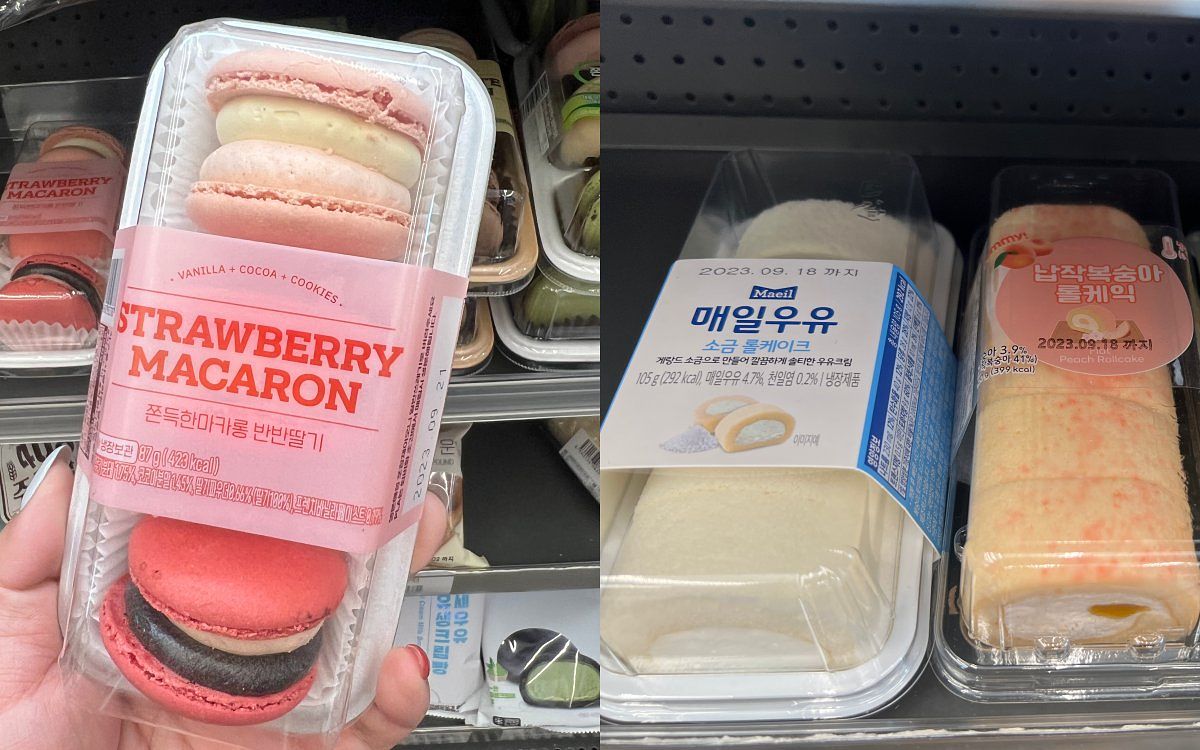 在CU的便利商店可以看到許多不同的甜點,在弘大的CU特派員甚至發現有單獨的一個甜點櫃!其中最推薦大家可以試試看馬卡龍組合、瑞士蛋糕捲,口味眾多、價格可愛,重點是吃起來也很不錯,記得來上一杯冰美式搭配!