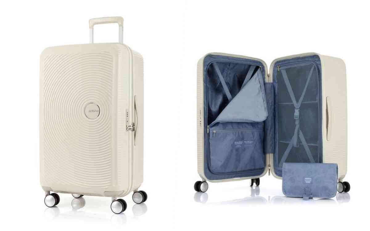 榮登品牌暢銷冠軍並榮獲德國紅點大獎設計肯定的Curio系列,以招牌的復古黑膠唱片外型,搭配繽紛色彩配色,打破行李箱無聊的暗色市場,也是American tourister最受歡迎的行李箱款之一,燕麥奶白色的清新柔嫩外觀搭配內裡霧藍色的設計,文青質感直接拉滿到頂點,顏值實在太高~想立刻入手!