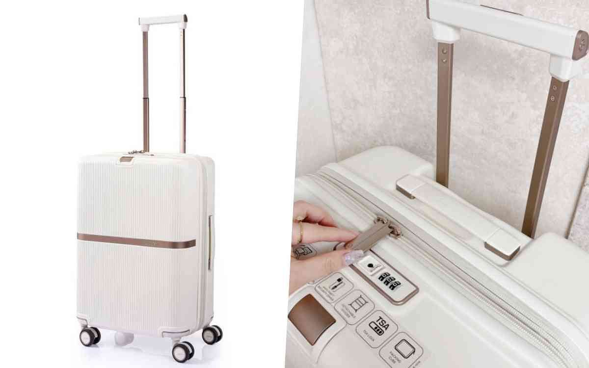 默默收穫許多使用者推薦好評的Samsonite MINTER行李箱,以都會時尚的極簡造型設計體現高雅不凡的質感,奶白色外殼上細長的垂直凹槽,搭配中間粉棕香檳色的鋁合金LOGO細節呈現出低調奢華的質感,這款璀璨亮眼的流金箱真的美得令人無法抗拒,只要一拉出門絕對詢問度超高!
