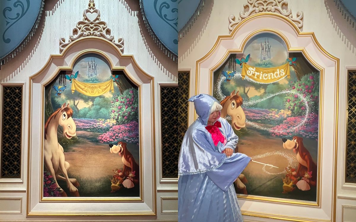 在「仙履奇緣童話大廳」通常不會需要排隊很久,裡面冷氣很涼也沒有限制觀賞時間,大家也可以在這看到「灰姑娘」仙度瑞拉在神奇魔法的穿針引線中與王子相遇後,各種相關的藝術作品。這邊也有許多的拍攝點,其中有兩幅畫就是神仙教母隱藏了神秘魔法,另一幅有神仙教母更好發現,另外正是照片中這張,使用「閃光燈」拍攝就可以發現的神奇魔法~