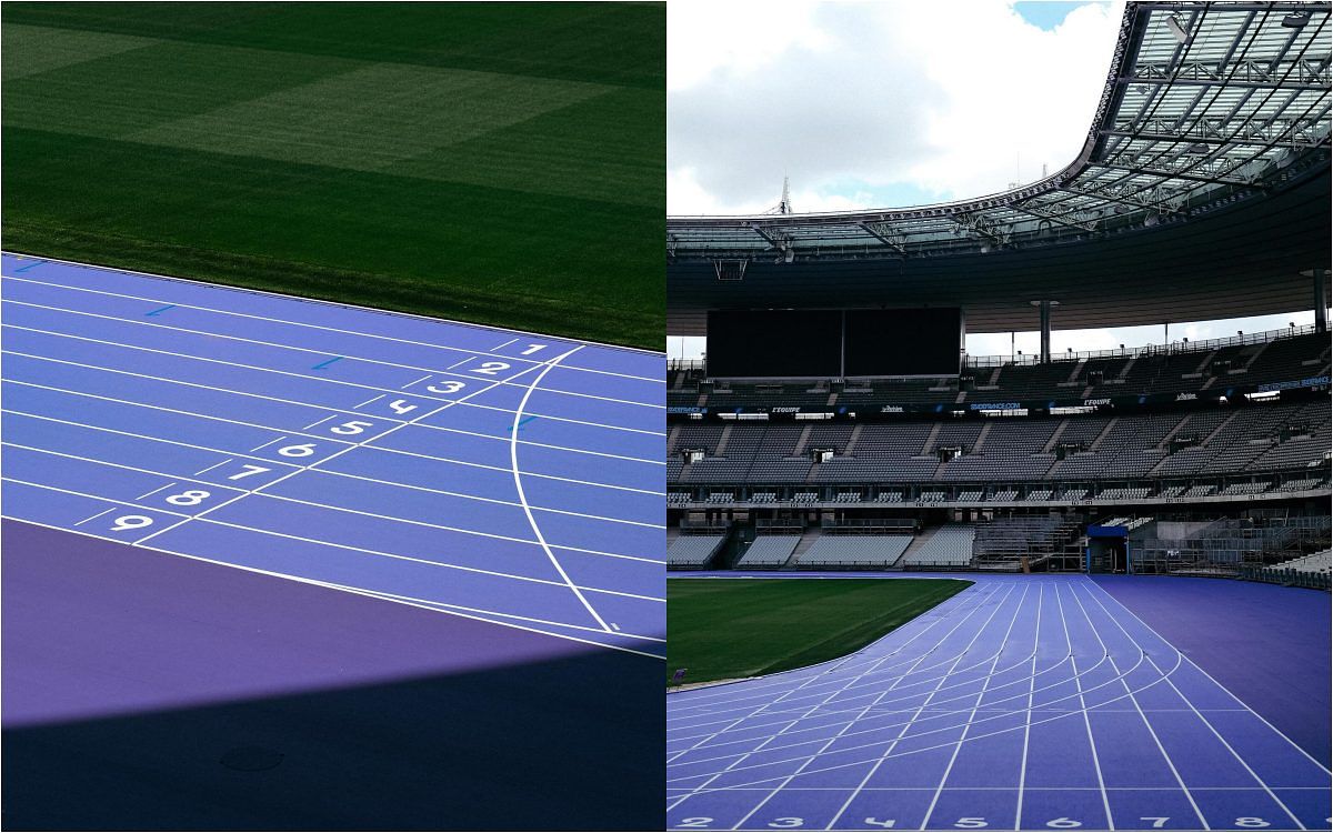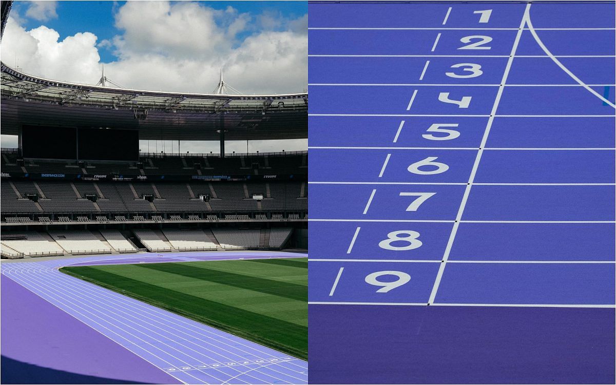 一改以往大家熟知的磚紅色賽道,奧運主場館法蘭西體育場(Stade de France)選用了紫色作為賽道的主色調,跑道是淺紫色、技術區域是深紫色,跑道外則使用灰色。