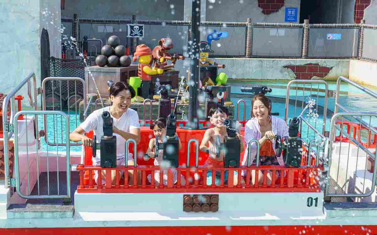 在「海盜海岸」戲水園區不全身溼透可是走不出去的!乘著海盜船用水槍瞄準目標與敵人的人氣設施「潑水戰Splash Battle」再升級,增加了多個可以射出高達約5層樓高水柱的水砲,對戰刺激加倍。戲水設施「防濺墊Splash Pad」則可以體驗到頭頂上每3分鐘就有裝滿多達約1,200公升水量的水桶傾瀉而下,一天的用水量甚至達約192噸,這般爽快感是只有這裡才體驗得到的。