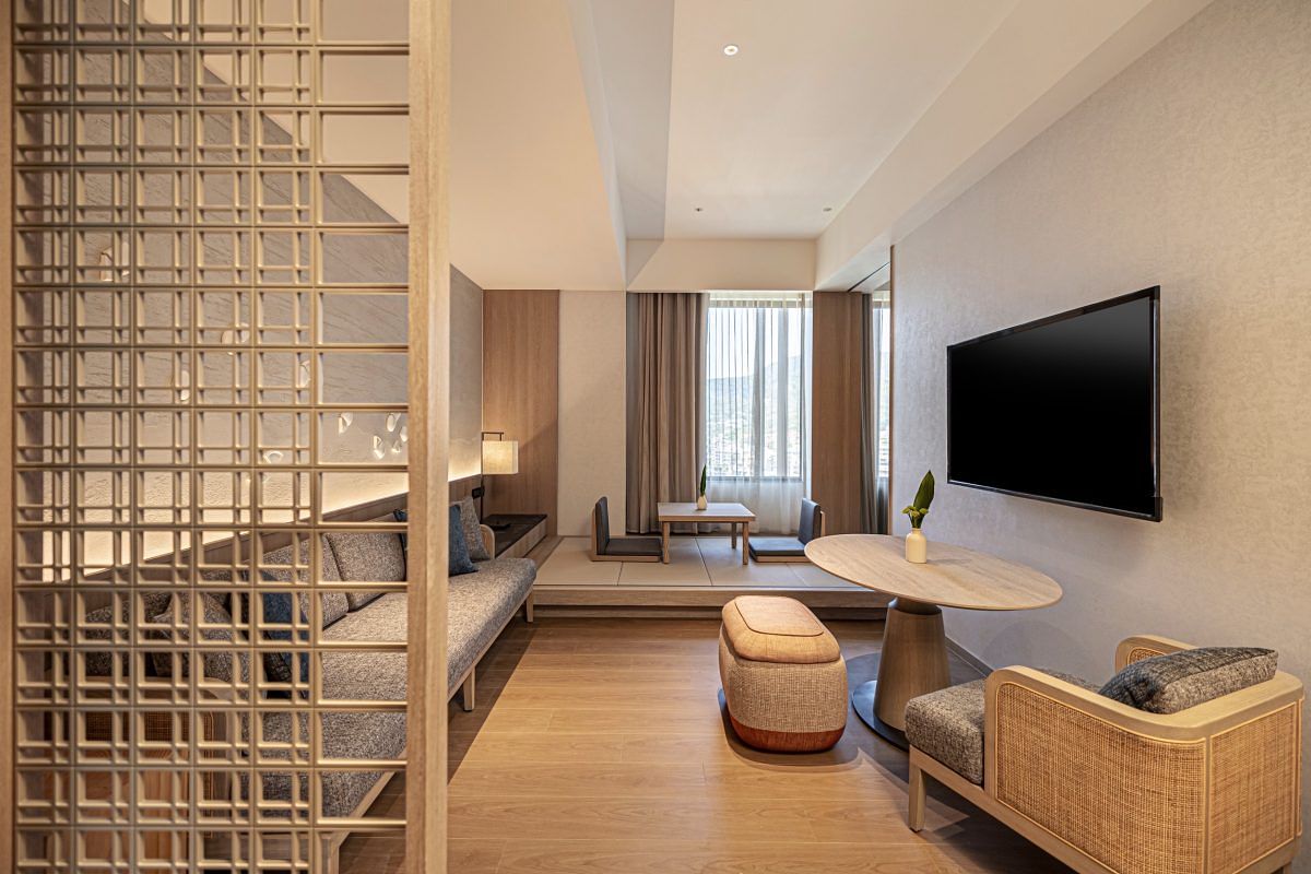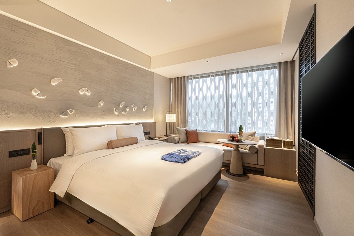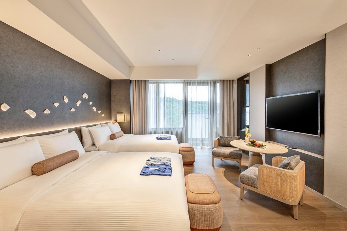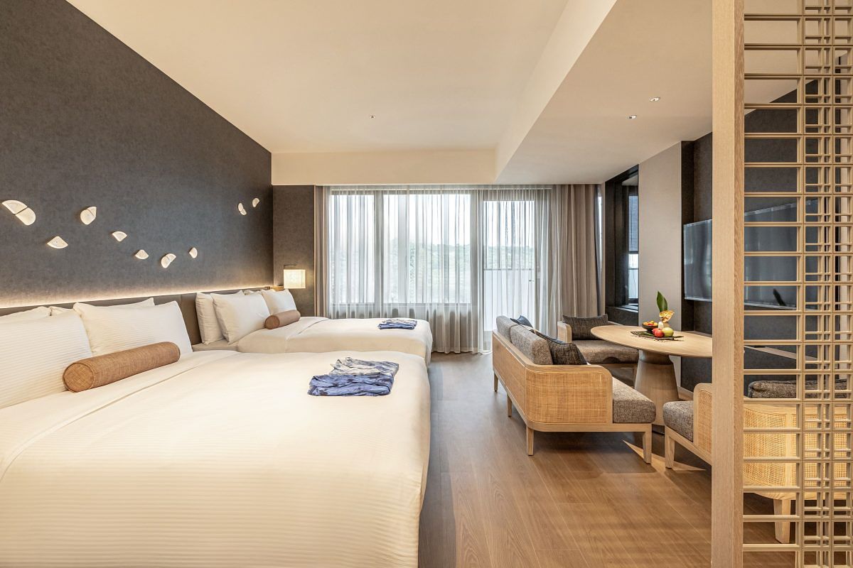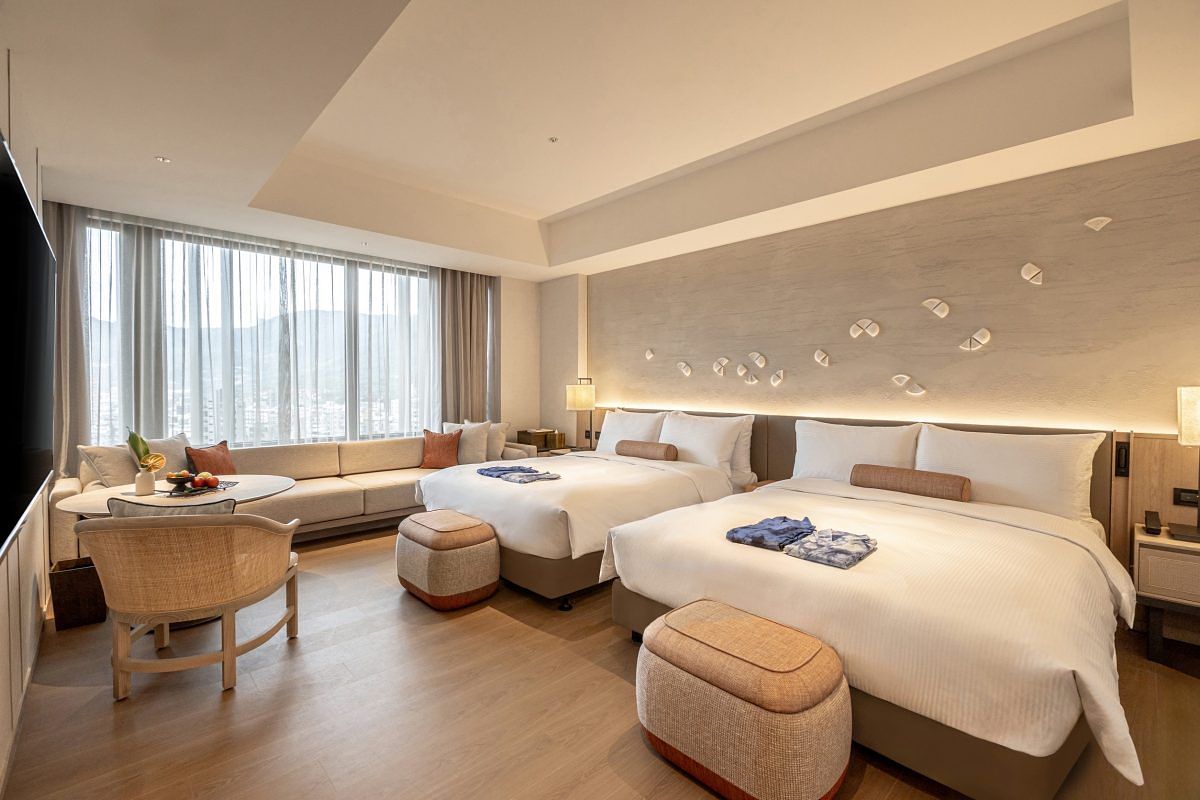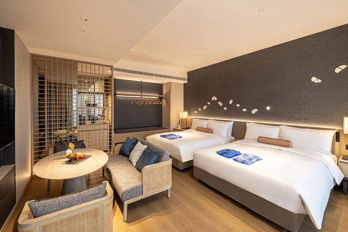 飯店內有100間舒適寬敞的客房與套房,設計融合日式禪風與大地元素,巧妙妝點台灣陶藝家手燒的蘭花陶片於東方靛青背景當中,象徵花舞滿天,落於大地,營造寧靜與沉澱心靈的境界。