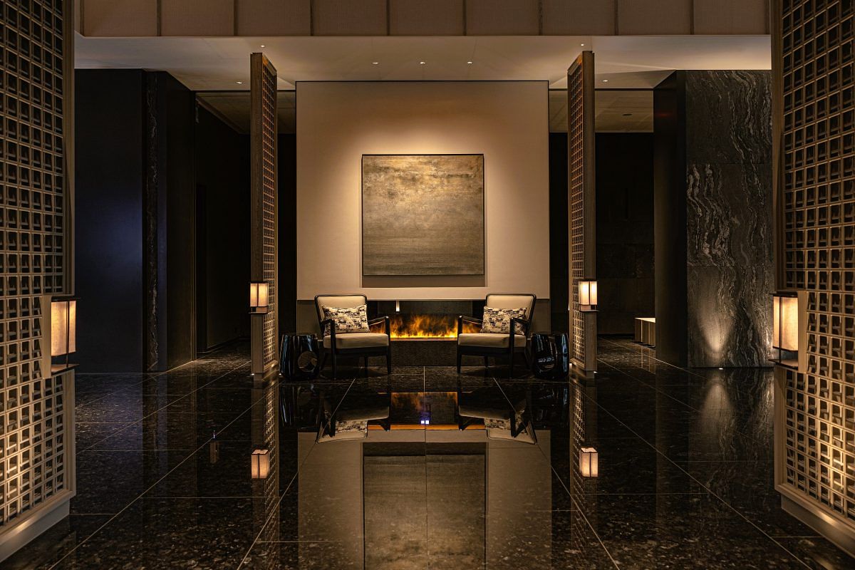 設計師以「泉、煙、岩、織、浸、紋」為靈感,入口玄關處的挑高格柵引入戶外景致,白天綠意盎然、晚間則有如城市中的一座大燈籠,低調質樸的微微發光,迎接到訪的旅客。進入大廳,黑色高亮面的石材地板映照出宛如溫泉水中的倒影,深灰色紋路的石牆如流水般輕柔,與格柵屏風及燈籠一同營造出繁華城市中的悠閒氛圍。