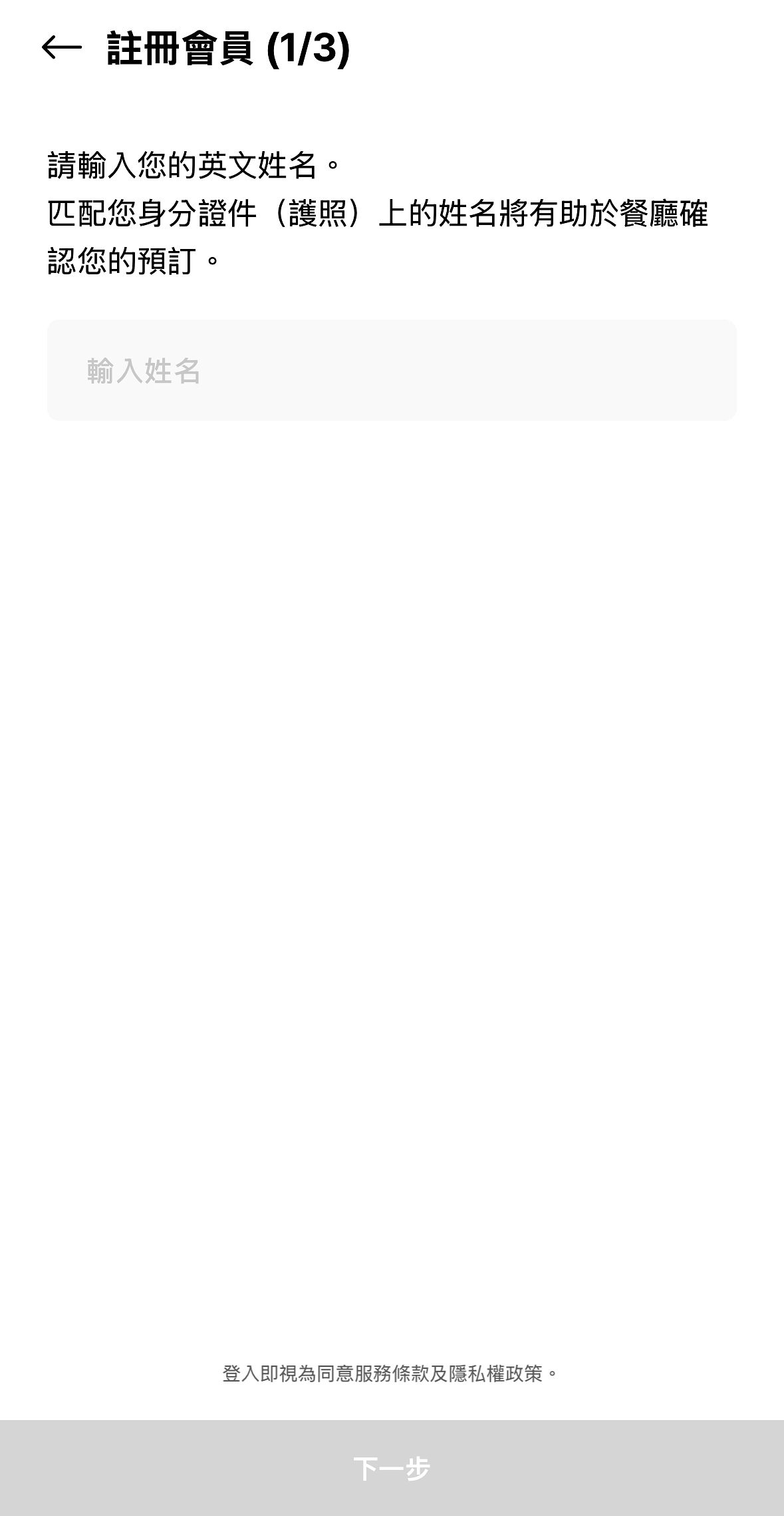 打開 App 後點選右下角的人頭圖示,接著就會跳出讓你登入/註冊的畫面,可以使用 Google 信箱、Apple 帳號或其他電子郵件註冊。點選要用來註冊的方式後,就會來到填寫名字的頁面,這裡要填寫與護照上相同的英文名字,有些餐廳在入場時可能會核對身份資料,確認是訂位者本人唷!接下來就輸入自己的電子郵件和國家以及介面優先顯示的語言偏好,最後一步勾選同意「CATCH TABLE」的使用條款及隱私權政策,這樣就註冊完成囉!