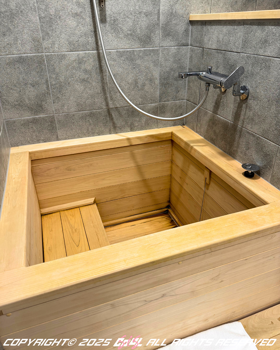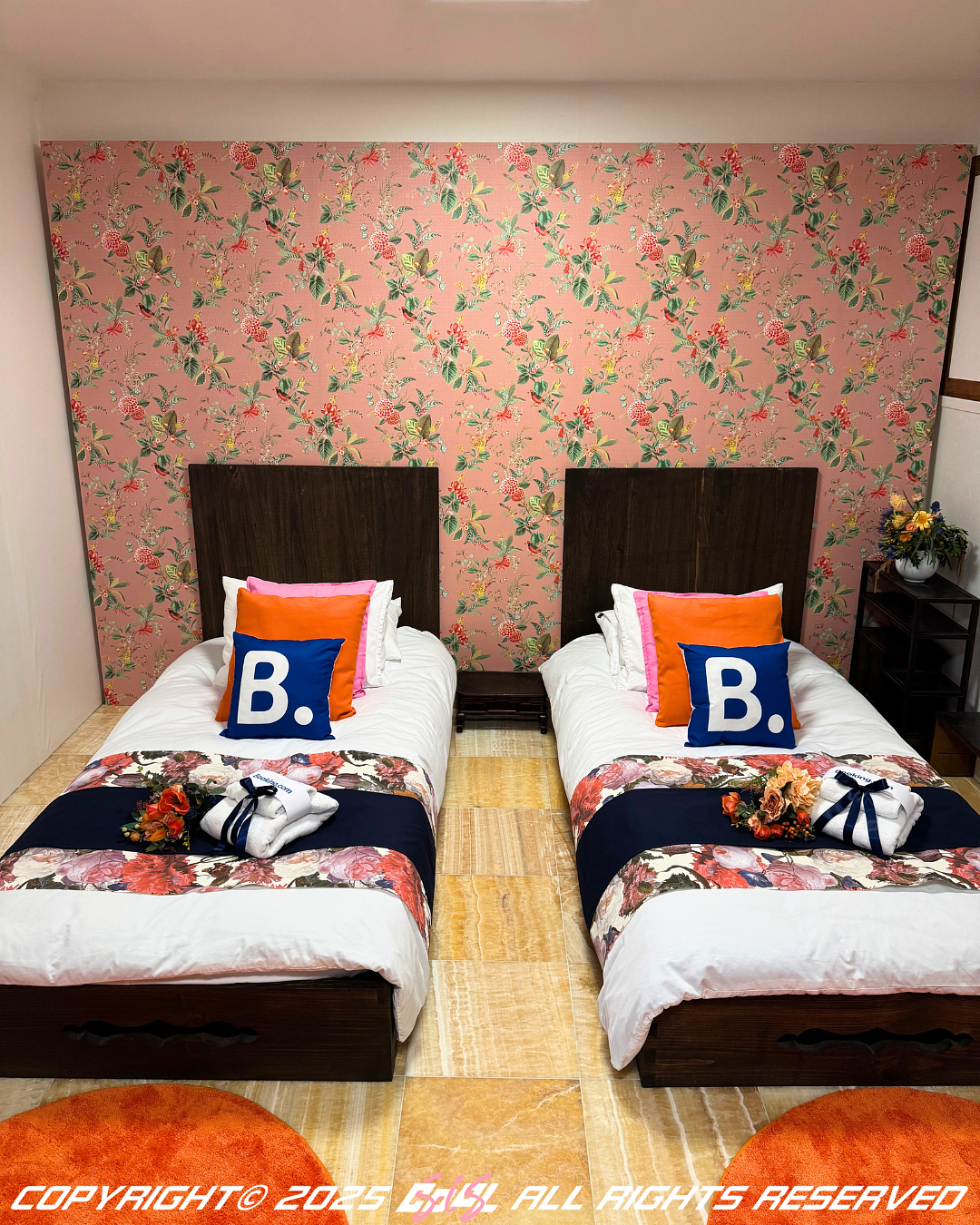 客房部分為兩張單人床組成的房型,同樣融入荷蘭花卉藝術與設計元素。客房對面則是沐浴空間,特別的是,裡頭不只有洗簌空間,還有一個木製沐浴池,供旅客在結束一天的行程後,能夠好好放鬆一番!