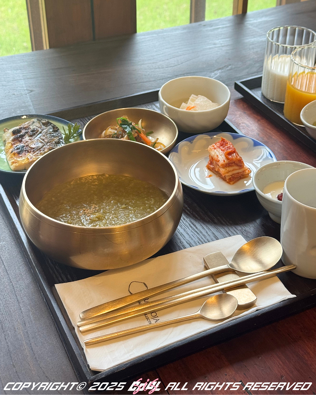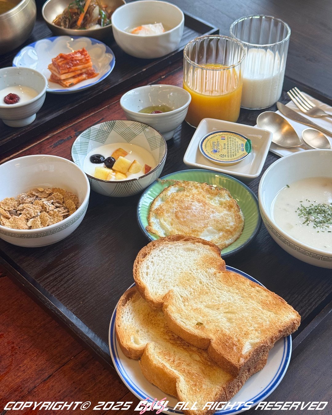 「樂古齋河回韓屋飯店」的早餐供應也相當豐盛,前一晚住宿服務人員就會先確認隔天的早餐住客想要韓式或是西式?韓式早餐主角為韓國鮑魚粥,還配有鯖魚、泡菜及其他小菜,養身又能吃得飽足。西式早餐則附上吐司、果醬、荷包蛋、麥片、牛奶、果汁和濃湯,這豐盛程度想不吃飽都很難呀!