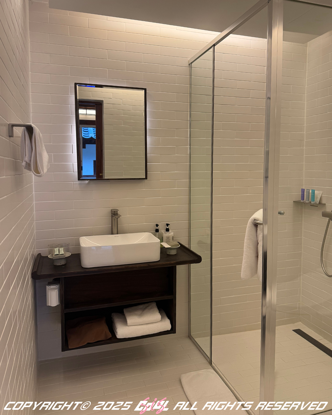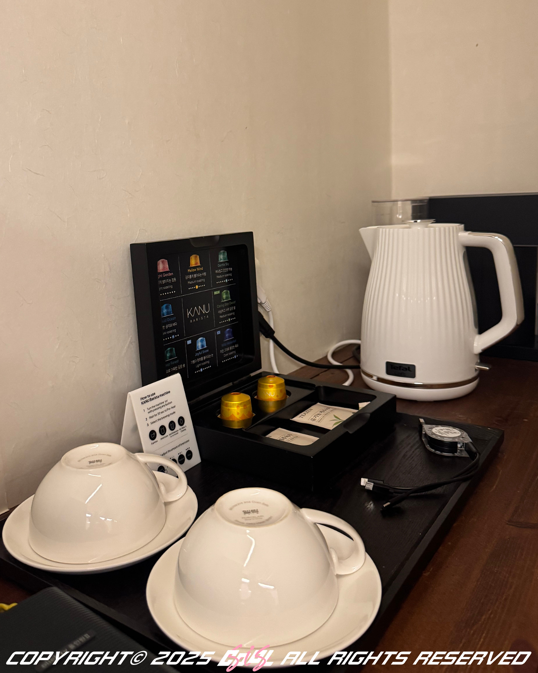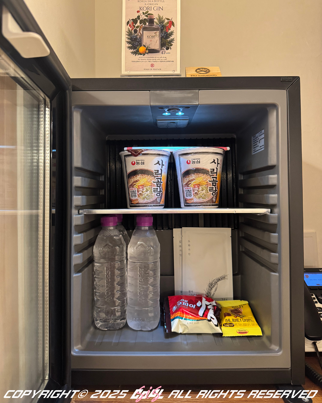 房間內除了提供基本的毛巾、盥洗用品、保險櫃、衣櫥、冰箱等,還超貼心備有不辣的韓國杯麵、巧克力派點心、堅果、礦泉水,冰箱裡甚至還有兩片面膜,晚上沐浴後想好好保養一番也不是問題!另外,房間內也有膠囊咖啡機和茶包,你想得到的、沒想到的都幫你準備好了!
