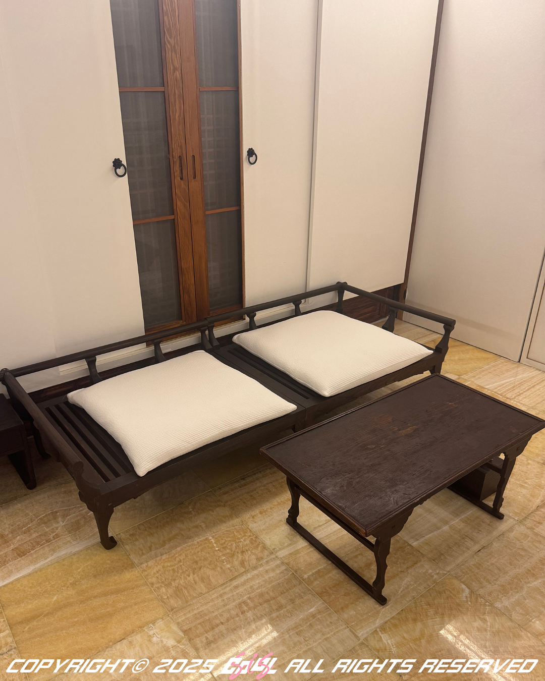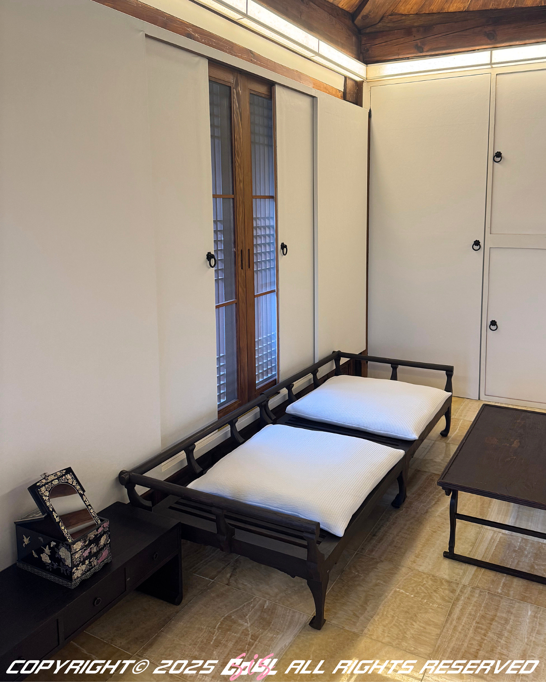 進入客房內可以發現,內部裝潢也融入許多古典元素,像是復古的梳妝台、沙發、衣櫃等,就連房間內的垃圾桶都是仿古代瓷器的造型,瞬間真的有穿越回古時朝鮮的錯覺呢!「樂古齋河回韓屋飯店」共有 9 種房型,根據不同房型分別可入住 1 - 4 人不等。若是選擇豪華套房、家庭套房、頂級套房、雙臥室套房或樓閣間房型,還配有浴缸供旅客沐浴及泡澡。