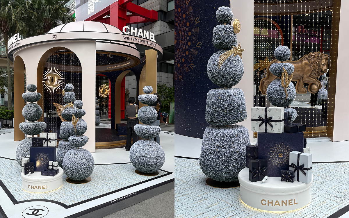 今年香奈兒的聖誕造景一樣沒有讓人失望!以「winter constellation 聖誕璀璨星辰」為主題,打造出一間彷彿在夜空中看星星的展望台,窗貼上還掛著經典的雙C logo 標誌光芒,展區的地上也佈滿星光點點,就像是在銀河裡拍照一樣浪漫。外圍還有被白雪覆蓋的球球造型聖誕樹,搭配金色飾品妝點,以及綁上黑色緞帶的禮物盒們。白天與夜晚拍起來都各有不同的氛圍感,不容錯過!